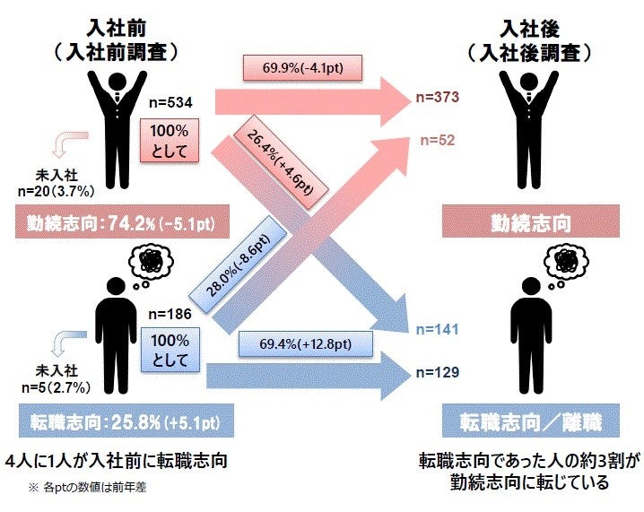 入社前に「転職志向」であった人の約3割が入社後に「勤続志向」に転じている