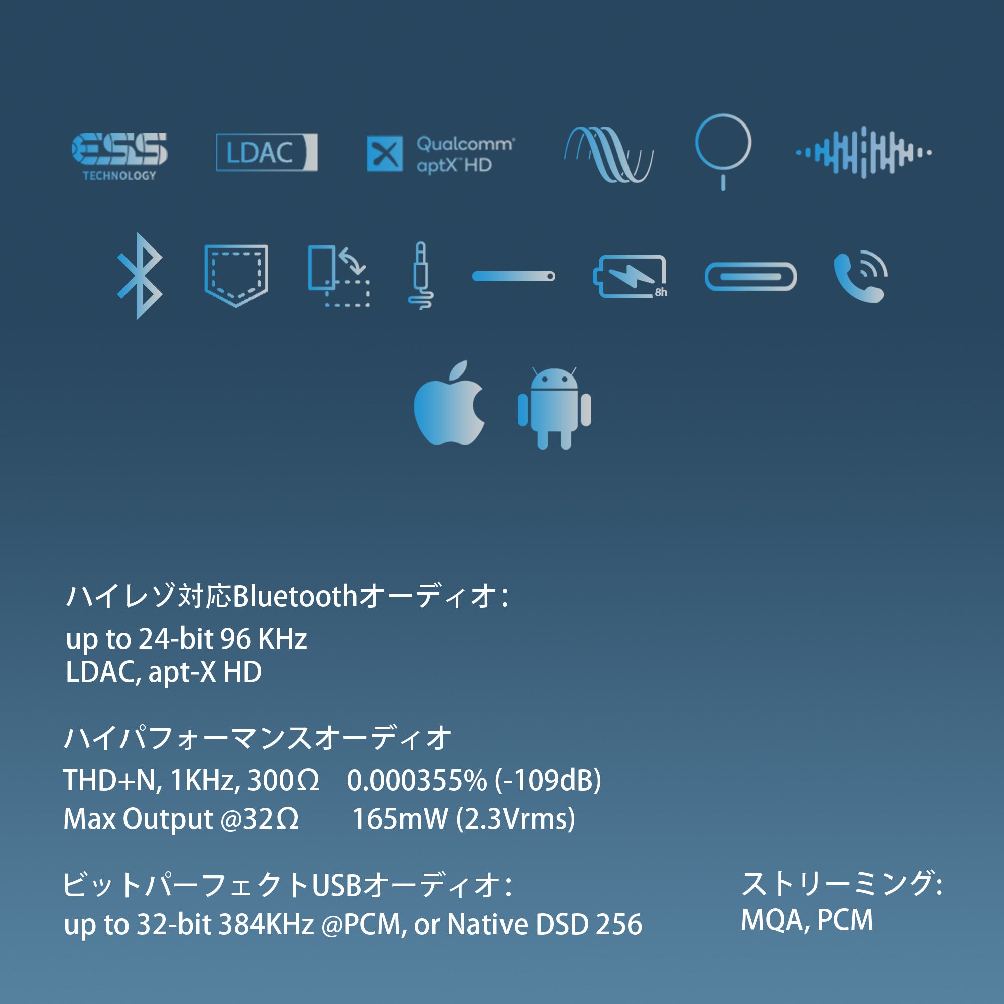 対応コーデック: SBC, AAC,aptX,aptX LL,aptX HD,LDAC