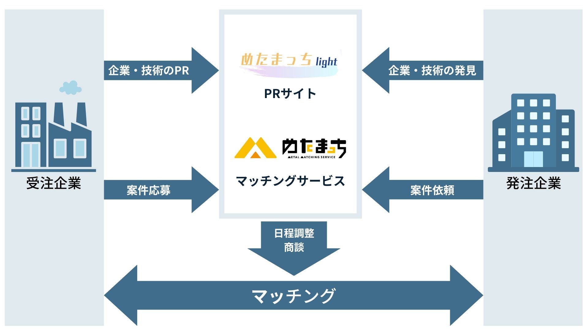 まず、マッチングサービス『めたまっち』についてご説明します。公的機関にもマッチング用の掲示板がありますが、あくまでも企業同士が直接コンタクトをとる必要があり、手間とコストがかかってしまいます。また、企業情報も最低限のものしか記載できないため、『めたまっち』はそこから1歩踏み込んだサービスを展開します。