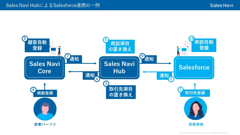 Sales Navi Hubは2023年5月1日から提供を開始し、標準機能であるため追加料金は発生しません。現在、連携できるSFAはSalesforceのみですが、各社SFAと連携できるよう、順次機能拡張してまいります。