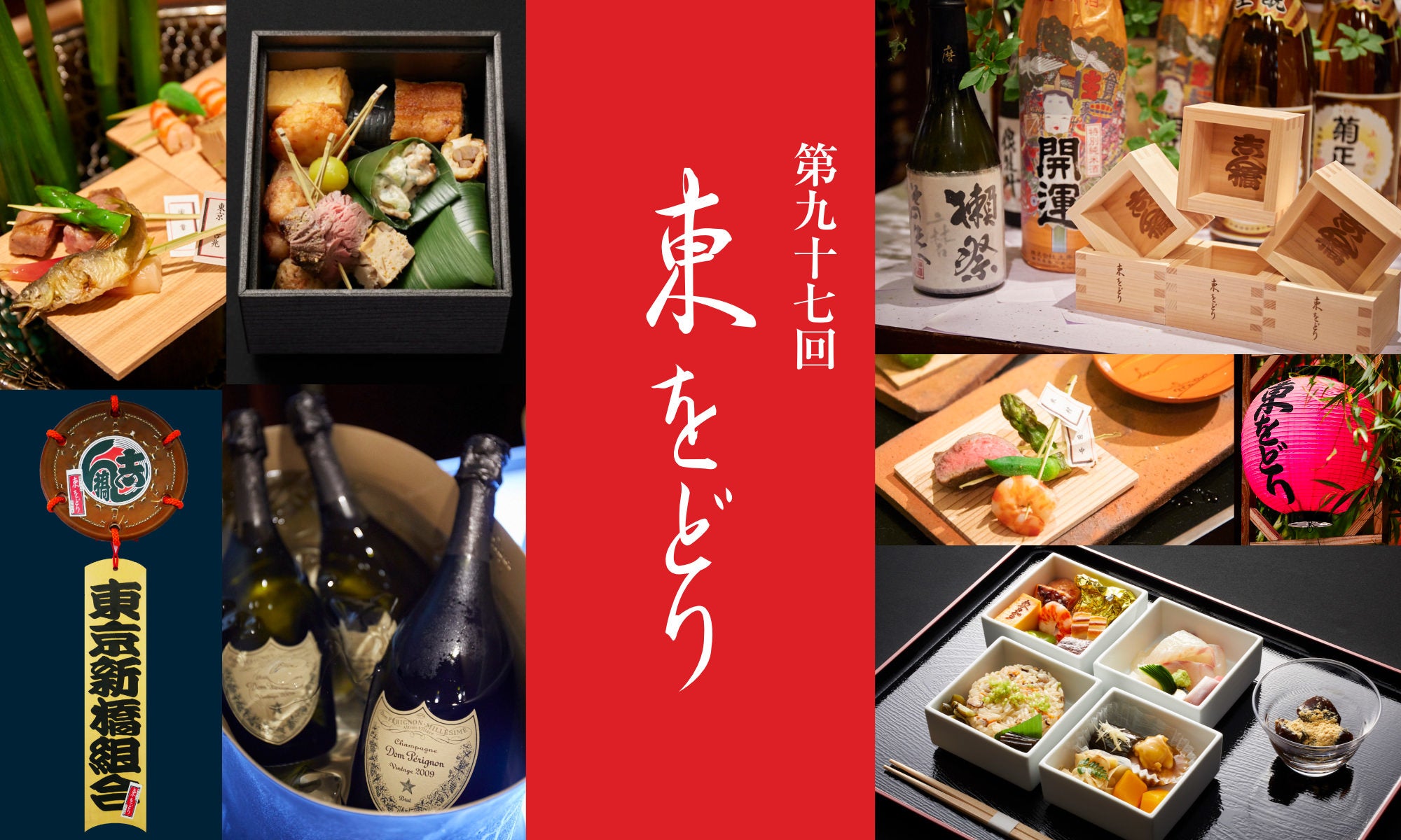 復活の東をどりは日本を遊ぶお祭り、料理、旨酒に酒肴、土産探し、東をどりの演舞場に、東京𠮷兆、新喜楽、金田中、松山、米村、わのふの六料亭をはじめ新橋一同、心込めて皆さま方をお迎えします。