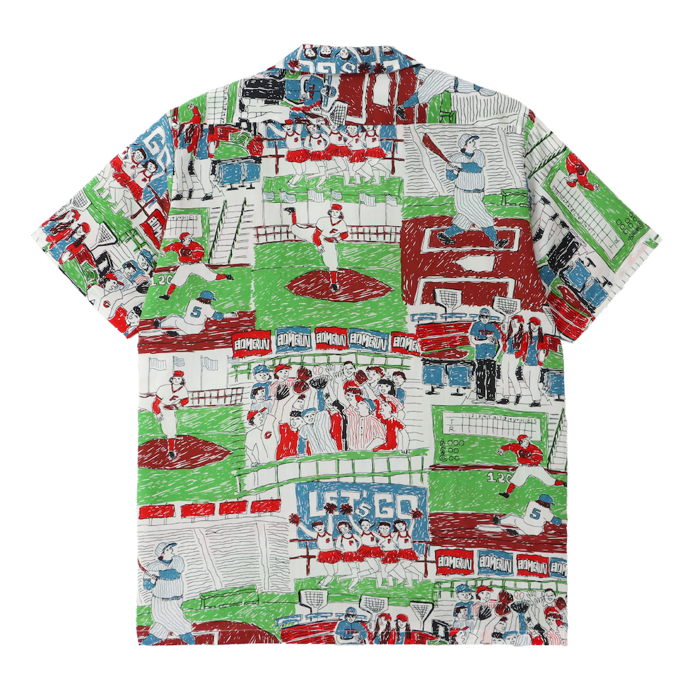「野球」をテーマに、スタジアムで起こる様々なシーンを繋ぎ合わせたアロハシャツ。アートワークはイラストレーターのShinya Ogiwara氏が担当。現地観戦だけでなく、ナイターを見ながら晩酌をしたり、酒場で仲間と野球談義することまで含めて野球が好き、という方に着て欲しい1着。【MAMA】