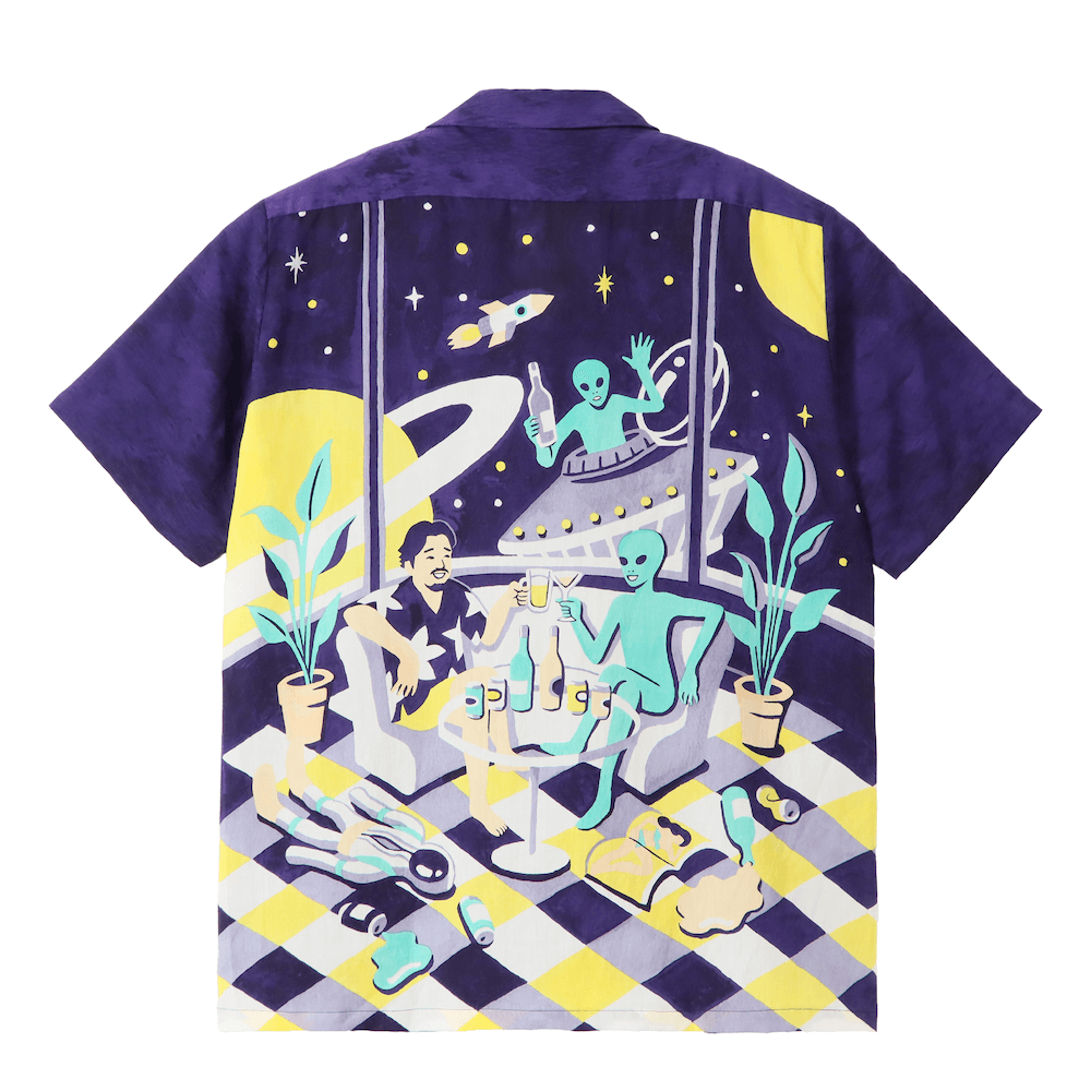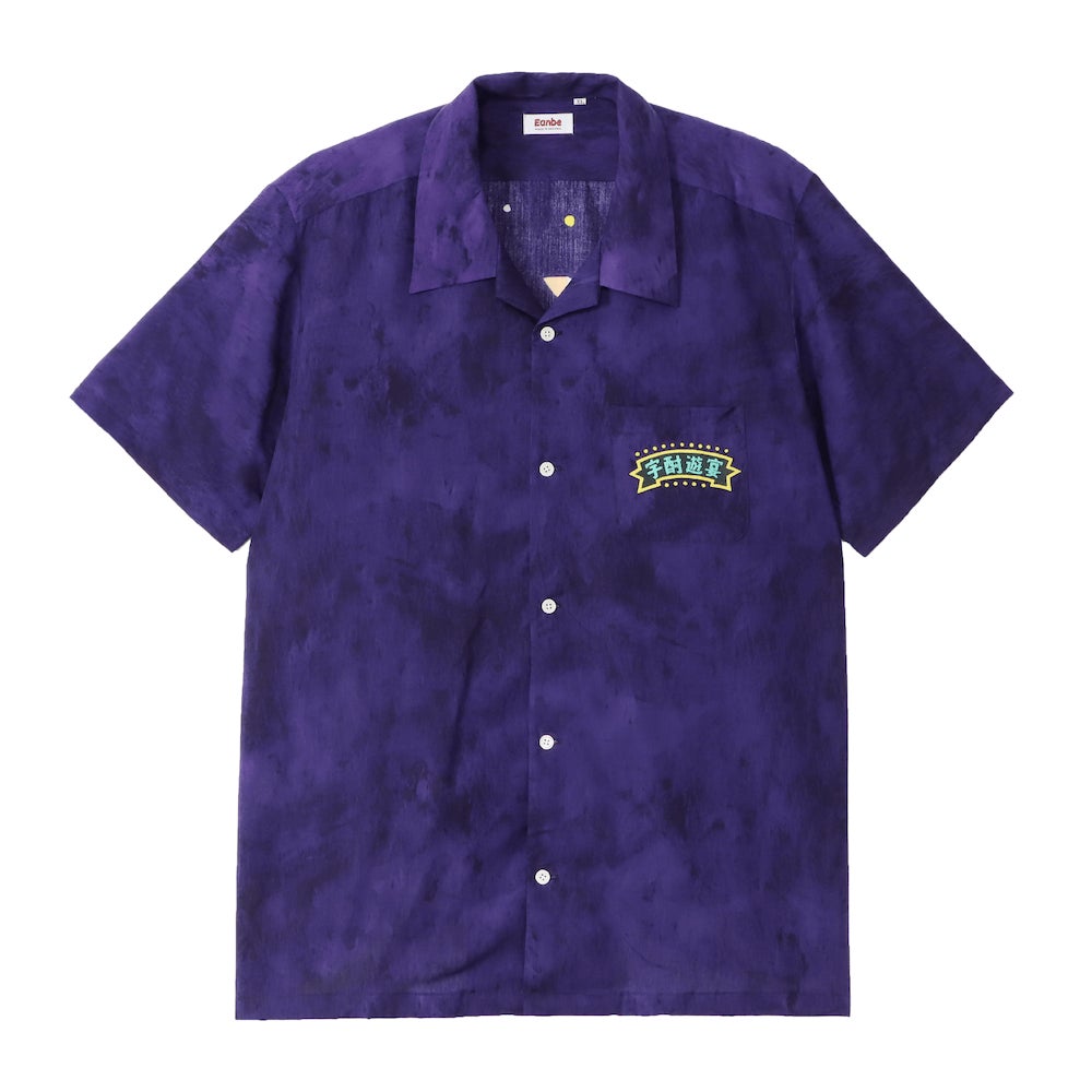 「宇宙での遊宴」をテーマに、宇宙飛行士と宇宙人が呑み交わす様を背面にプリントしたバックパネルのアロハシャツ。アートワークを担当したのはイラストレーターの紙谷俊平氏。深みのあるパープルネイビーのボディに、パステルカラーで彩られた宇宙人や背景が映えるデザイン。「宇宙人と一緒に月見酒」なんて楽しい未来を想像しながら着てほしい1着。