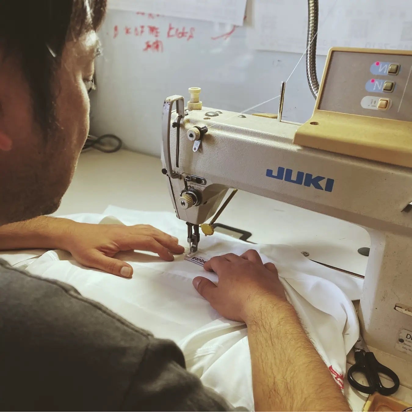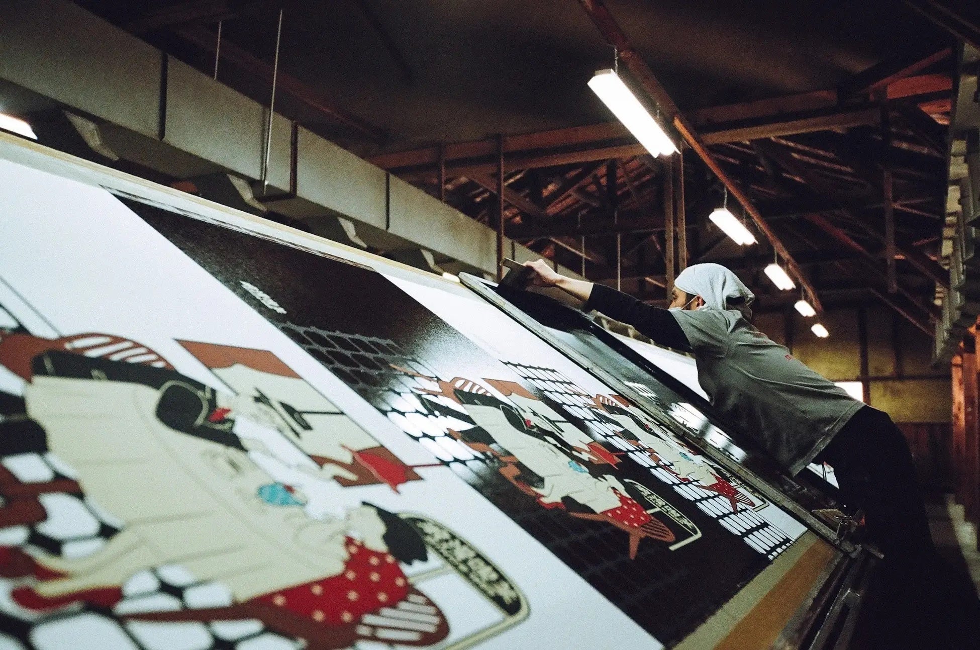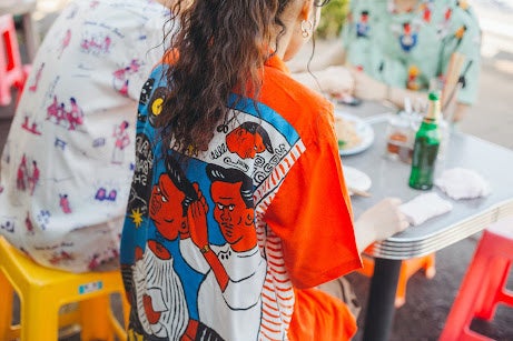 シャツのプリントは、複雑な柄を美しく表現するために、 京都の歴史と伝統ある染工場で「手捺染」と呼ばれる技法を用いて染め上げられます。 手捺染は、職人さんが手作業で布に1色ずつ丁寧に染めていく方法で、 柄の再現度が高く、繊細な色合いを表現することができます。そうして染められた生地を、 沖縄の職人さんによる手縫いで1点1点縫製することによって完成し、 あなたの元へお届けします。