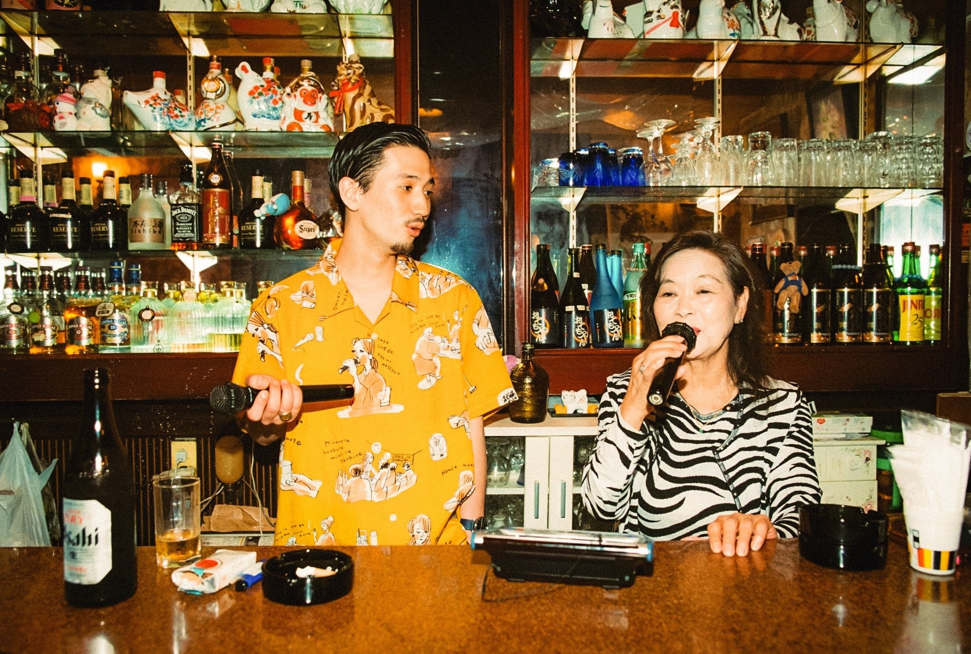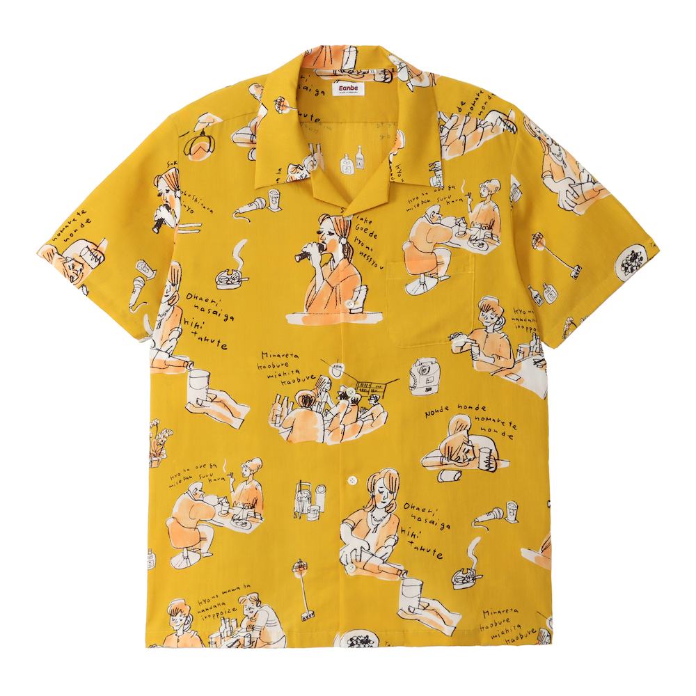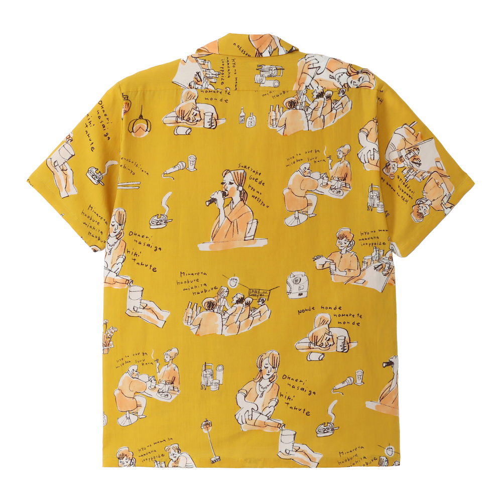 「スナック」をテーマに、ママと客の人情溢れるやりとりをプリントした総柄のアロハシャツ。アートワークはイラストレーターのヤマサキタツヤ氏が担当。渋いイエロー&オレンジのカラーリングに、小粋なイラストがハマる1着。"大人の社交場"に繰り出したくば、少しカッチリしたパンツを合わせてシックにキメるのがおすすめ。