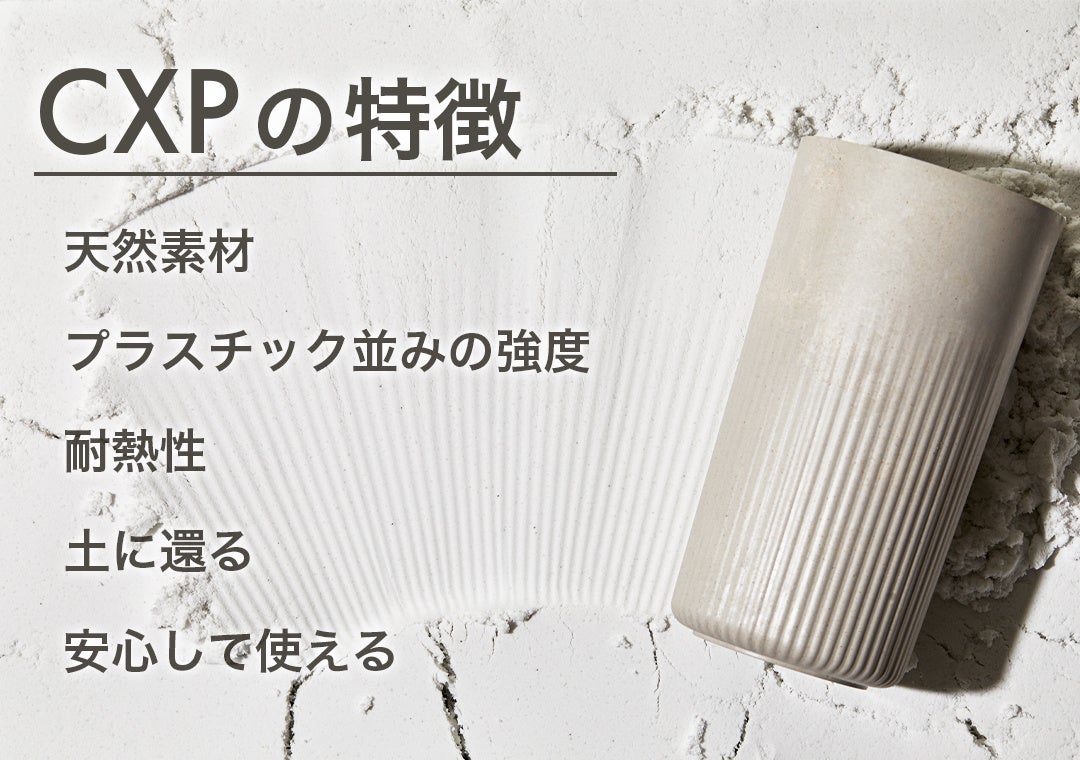 CXPは、森の木の間引きや製材で生じる林業副産物の「小枝やおがくず等」、自然界に存在する「天然ミネラル」、その他の「天然素材」を併せた複合素材です。