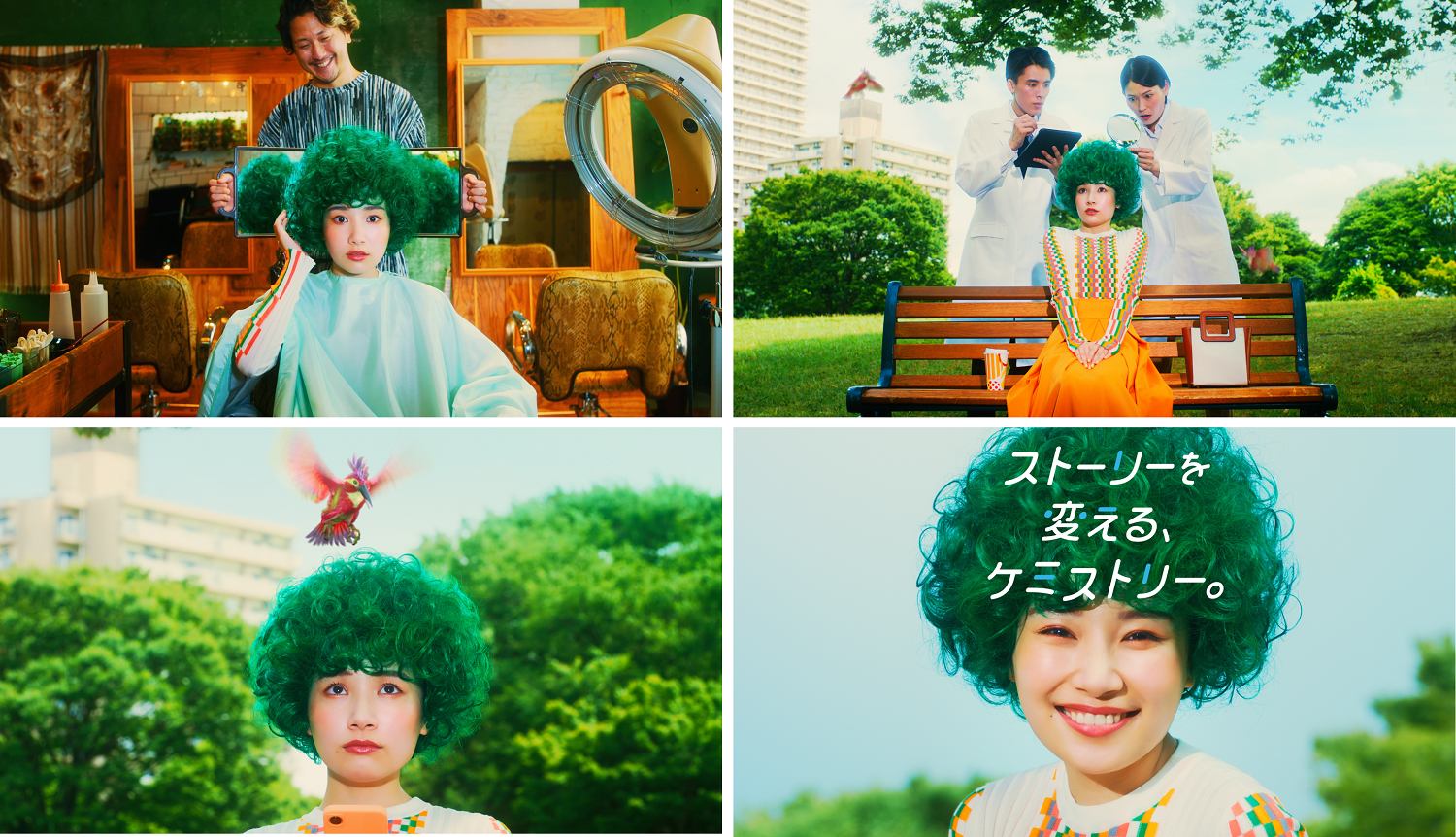 はじまりは、パーマという化学反応。実は日々の生活の身近なところで接している化学反応をきっかけに、思いも寄らない展開となっていく様子を、“化学が未来を変える”というストーリーでユニークに表現しています。
