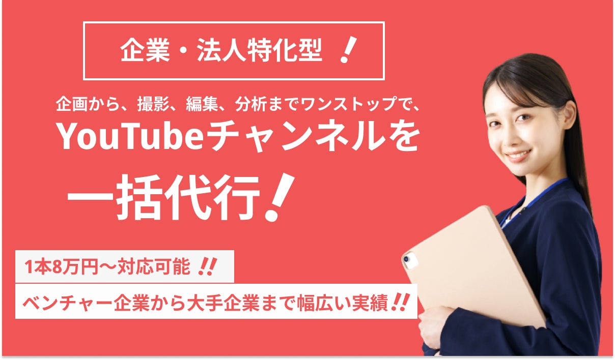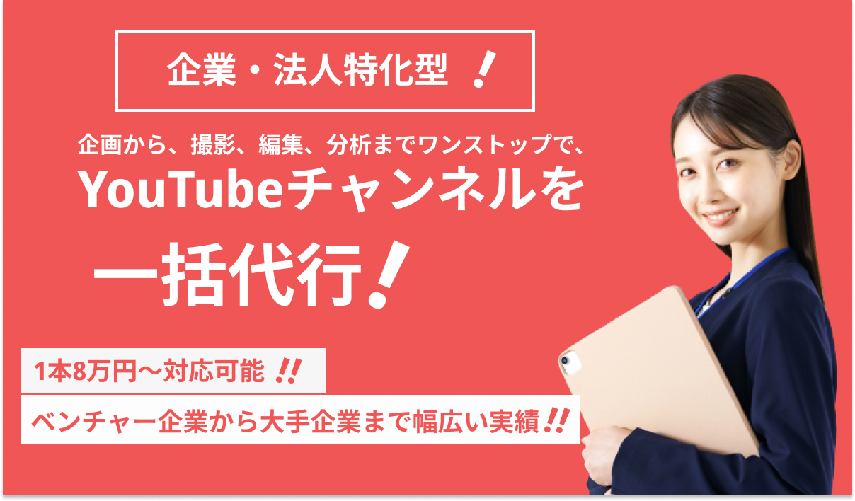 1本8万円で動画の撮影・編集・サムネ・タイトル・概要欄の設計から、YouTubeアカウントの運用(アップロード作業等)まで、YouTubeチャンネル運用に必用な最低限の業務をご発注いただけます。