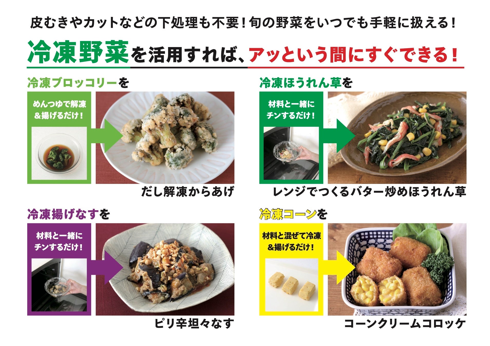 冷凍野菜の魅力の解説、常備しておくべき冷凍野菜、さらには簡単でおいしい活用レシピを掲載。