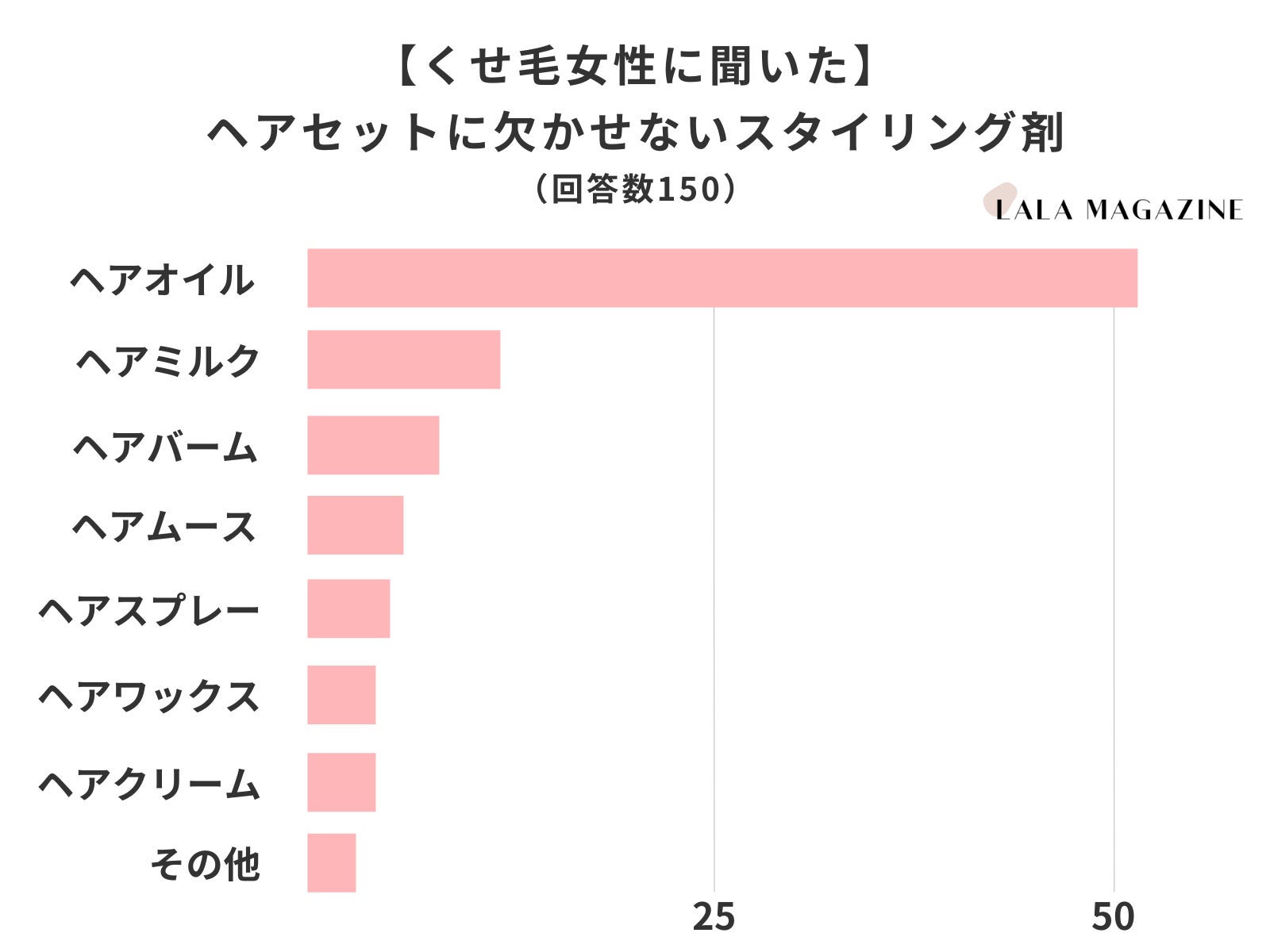 アンケート調査の結果、くせ毛の女性が絶対欠かせないスタイリング剤1位は「ヘアオイル」でした。