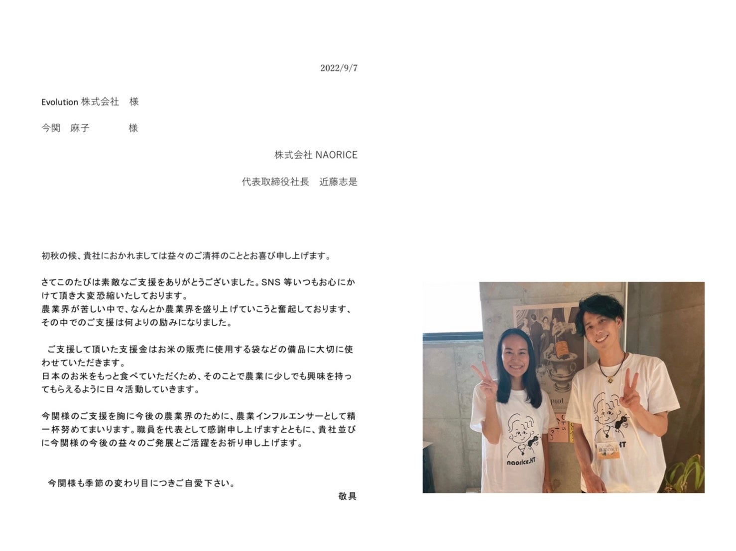 集まった農家支援金をお米農家(株)NAO RICEさんへお贈りしました