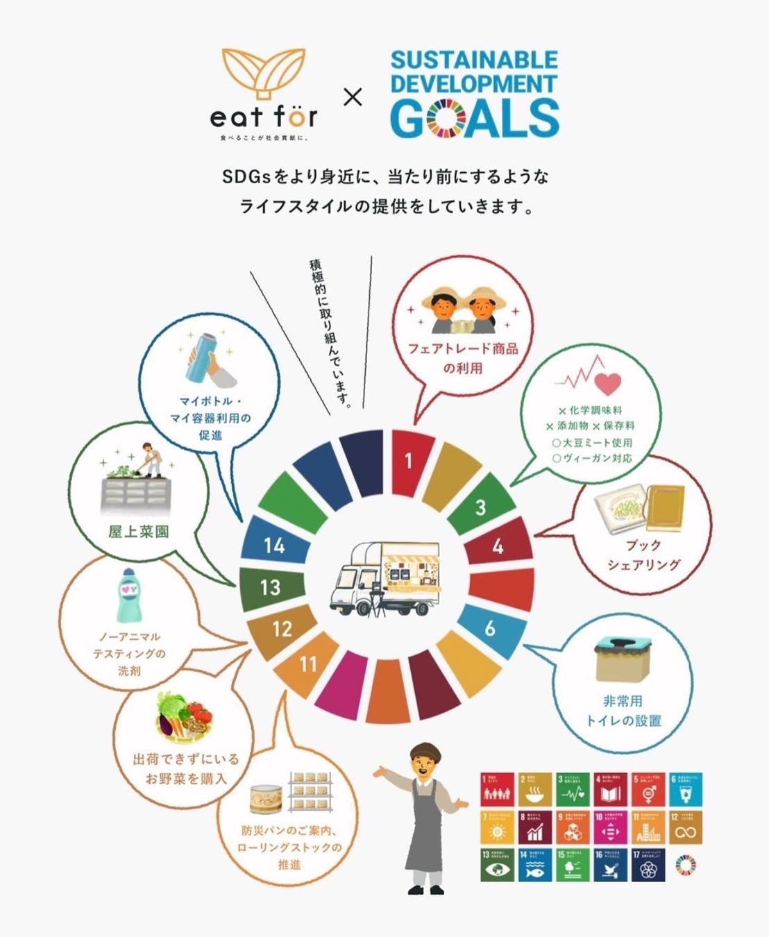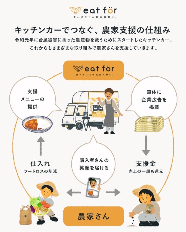 キッチンカーeat for(所在:東京都世田谷区、代表:今関麻子)は、2019年の〝令和元年東日本台風〟の農業被害の状況を知り、2020年2月にオープンした「食べることが、社会貢献に。」がテーマのキッチンカーです。