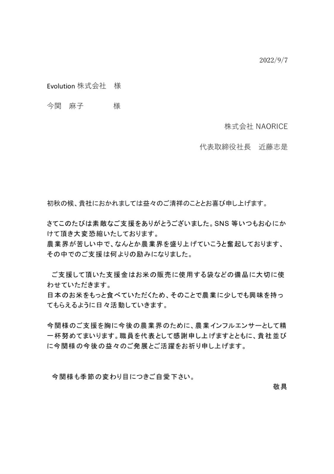 (株)NAO RICE さん よりコメント