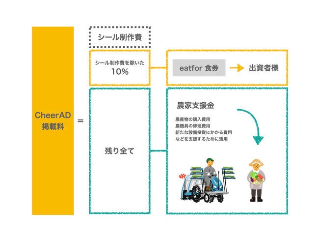 ロゴシール作製にかかる費用は、広告料金から支払い、ロゴシール制作費を除いた金額のおよそ10%にあたる金額分の食券を、企業・団体様にお渡しいたします。残る全ての金額を、フードロス削減につながる農産物の購入費用、ならびに、農家さんの農機具の修理や新たな設備投資にかかる費用の支援金といたします。