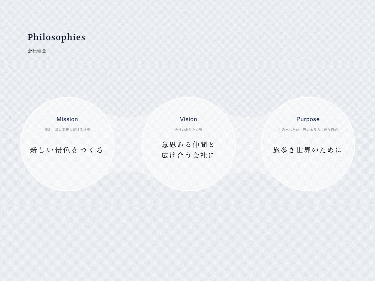 今回コーポレートアイデンティティを再構築するにあたり、自分たちの会社の芯にはなにがあるのか、これから先どんな会社になろうとしているのかを今一度よく考えました。特に会社理念については、「これをすれば絶対にうまくいく」といったような正解が用意されているものではありません。派手でなくとも、媚びず、嘘をつかず、真面目に真っ当に考えた先で出てきた言葉を掲げることにしました。Purposeに設定した「旅多き世界のために」は、私たちの事業が、人と人、文化と文化、国と国を悠然と繋ぐものであるように、と願って生まれたものです。旅や旅行の多い世界が人々にとって明るい、いい世界であることを信じ、そのあり方に関わる会社でありたいと思います。