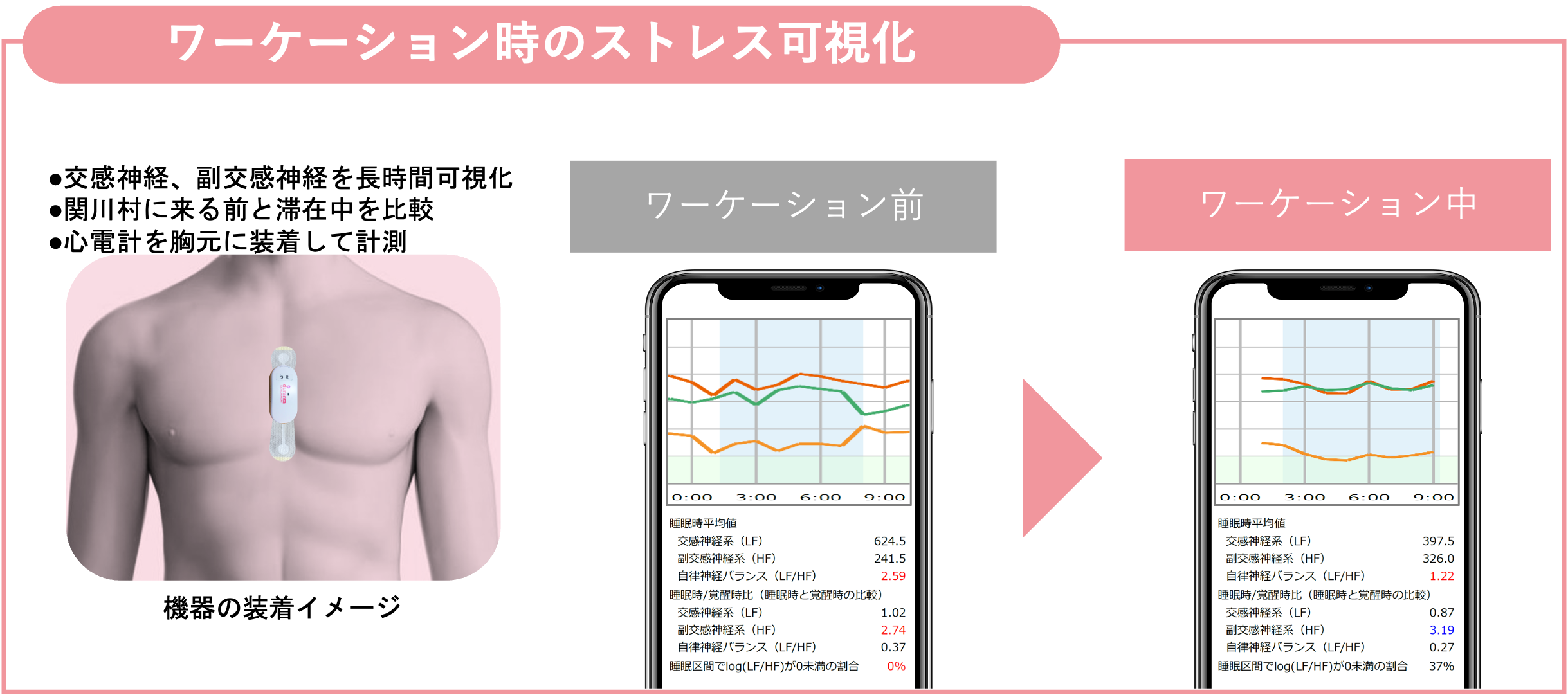 これらを実証すべく、当社は関川村に訪れるワーケーション参加者を対象に、滞在前と滞在中に「ホーム心臓ドック®」で、ストレス、睡眠の質、健康診断では見つかりにくい軽度な心疾患の有無等を可視化する実証実験を行います。