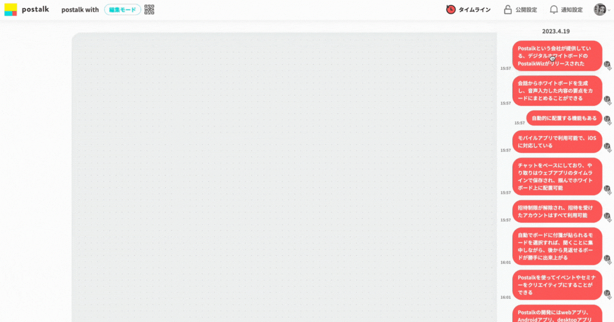 議論を付箋化する上で「会話が自動ですべてボード上に貼られていくモード」と「会話がタイムライン上でテキスト化され、選択したものをボード上に移動するモード」の2つのモードを選ぶことができます。議論のシチュエーションや性質によってモードを切り替えることが可能です。