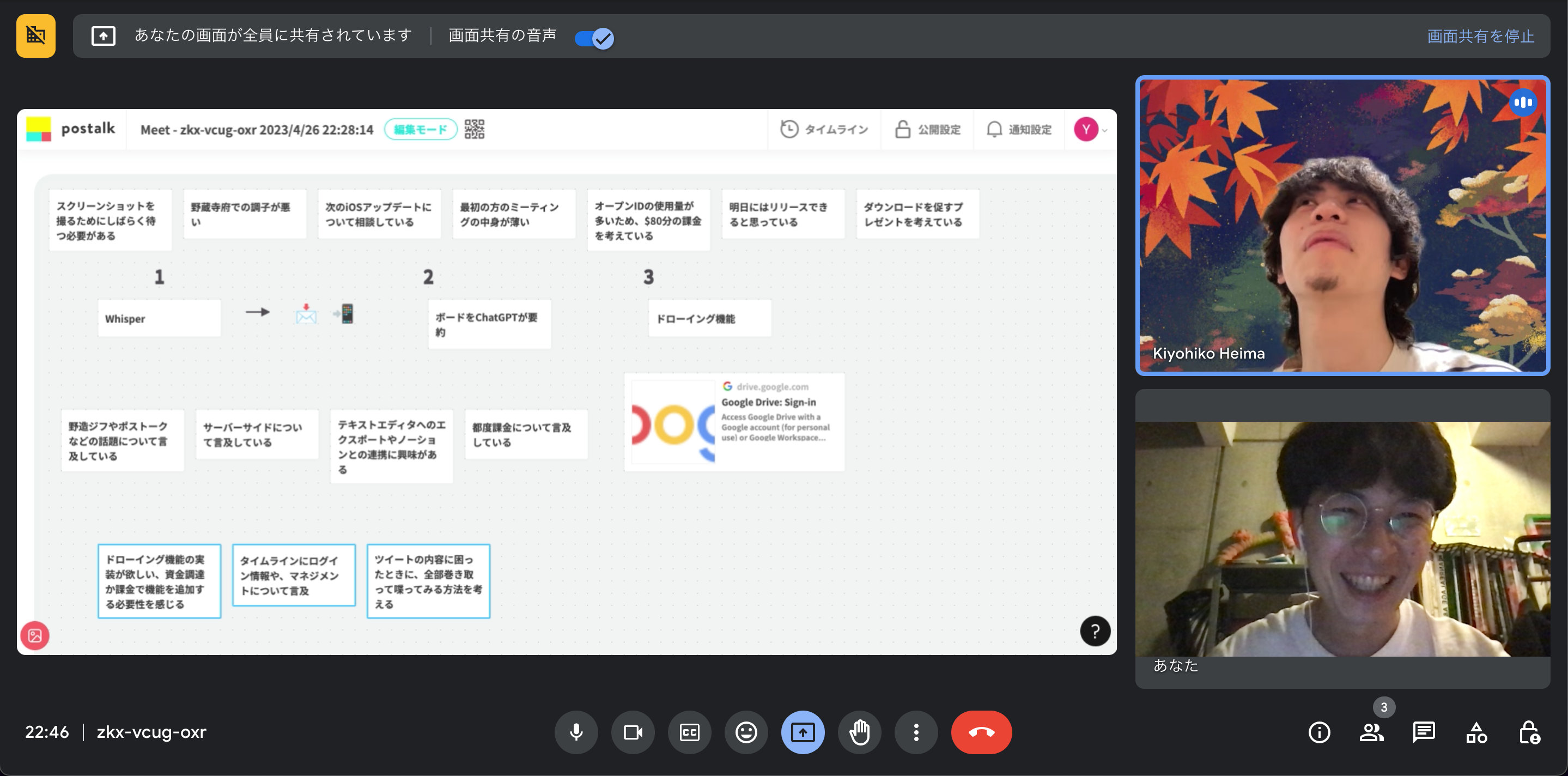 このような状況において、急速に最新のAI技術を享受できる時代が到来し、「Whisper」で高精度に会議をテキスト化し、「ChatGPT」で議論を文脈に沿って整理することができるようになりました。そしてこれらのAI技術を使って、話したことを自動で付箋にする機能を形にでき、postalkを使った議論をより深められることが分かりました。