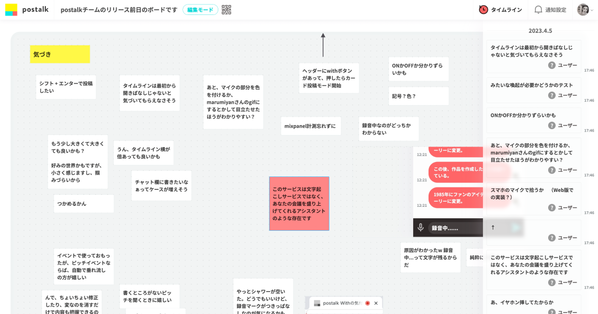 それだけでも、仕事におけるテキストを通じたコミュニケーション機会の記録と共有という重要な機能をまかなうことができています。そして、音声入力の機能が加わることで、postalkは次のフェーズに移行したのではないでしょうか。