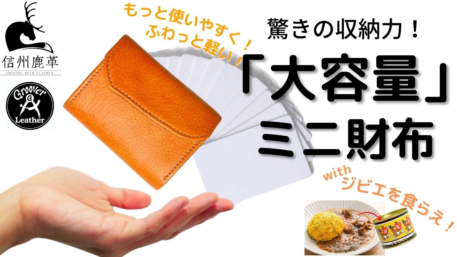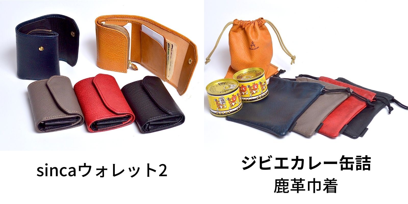 ジビエカレー缶詰(右)は手書きアーティストに依頼したオリジナルデザイン、鹿革巾着(右)は柔らかさを感じられるように一枚革で仕上げております。