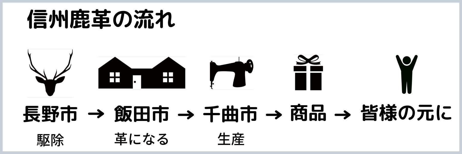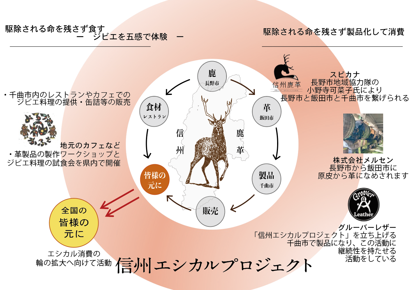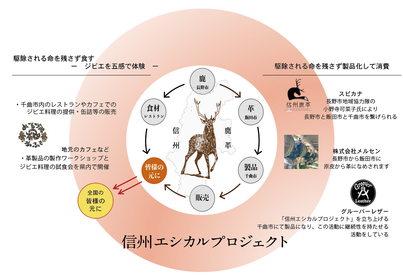 ■「信州エシカルプロジェクト」では、長野市営ジビエ加工センターで処理加工され、食肉と鹿革とで分けられます。革は飯田市の「株式会社メルセン」でなめし加工し、千曲市のグルーバーレザーで商品化することで、持続可能な産業の育成を目指しています。また、このプロジェクトを通じて、エシカル消費の輪の拡大を目標としております。