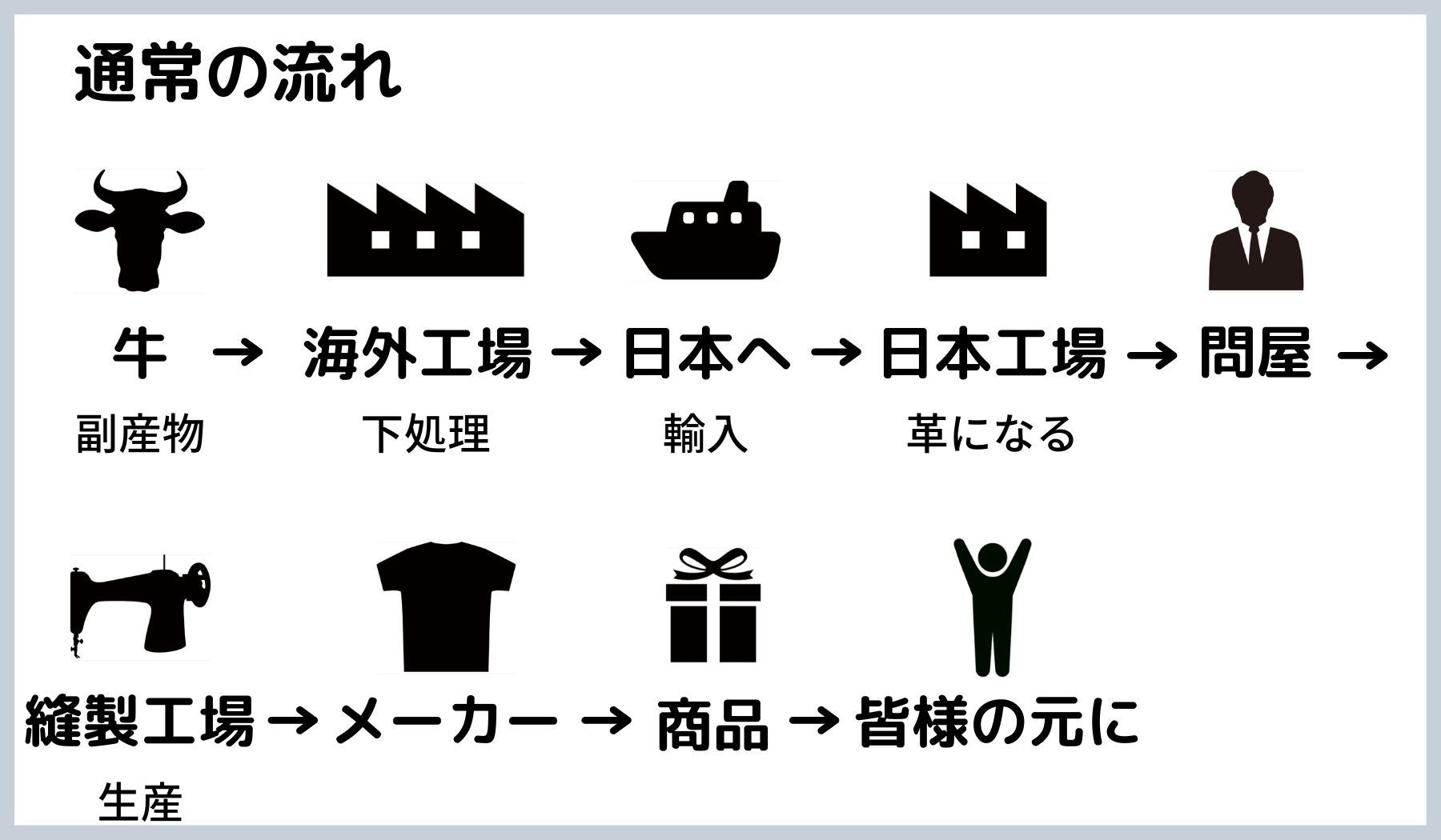 ■皮の原皮は海外からの輸入が多く、製品になるまでの道のりが長いものが一般的な流れになります。
