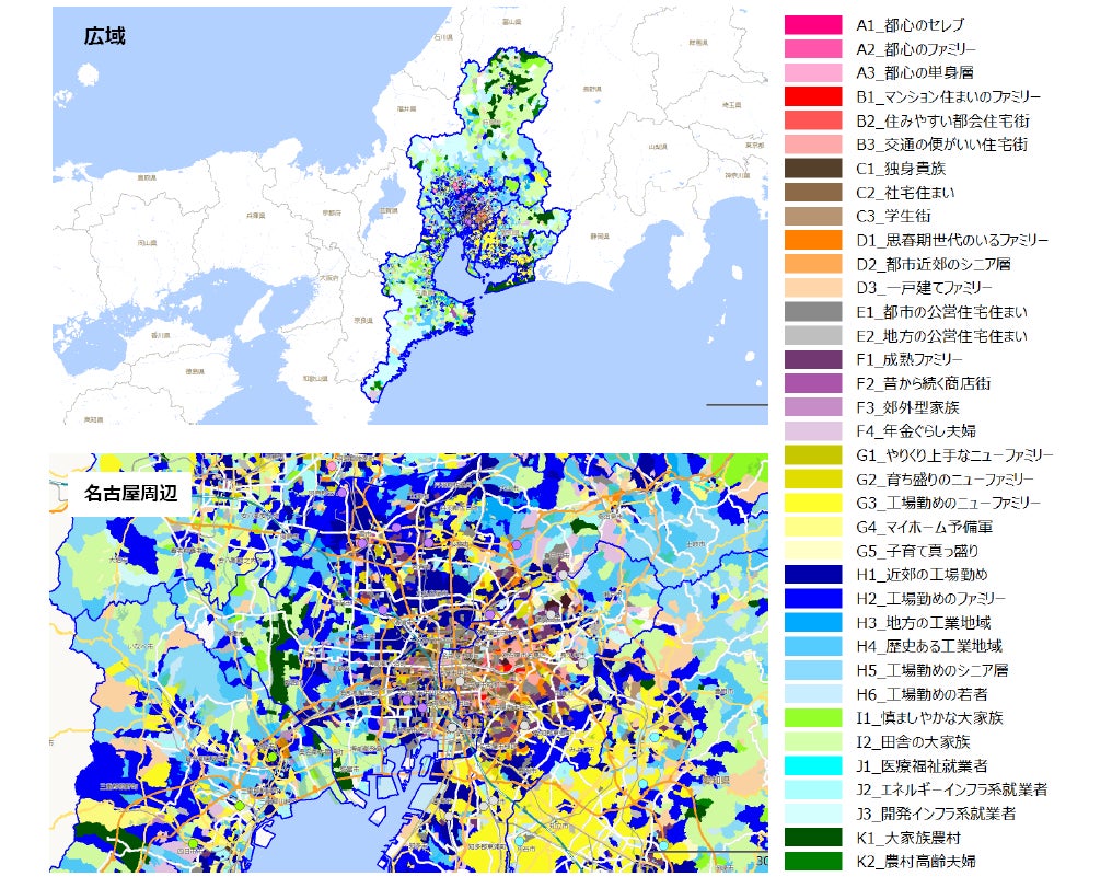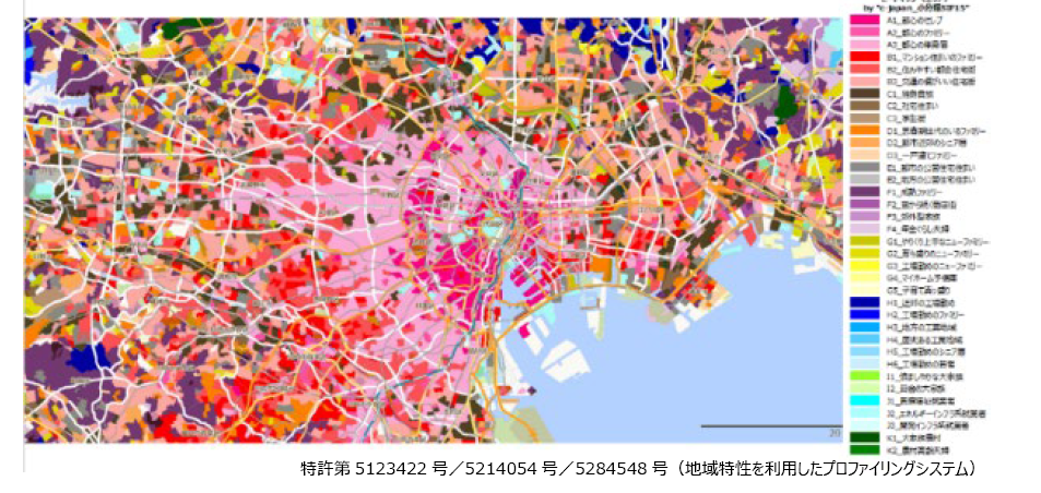 c-japan(R)は、日本全国の町丁目/郵便番号界/メッシュを、年齢/家族構成/住宅/就業等や年収/地価、さらに車種別自動車登録台数、チェーン店舗の位置情報の小地域データベースを用いて、当社独自の特許技術により11の中分類・36の小分類にクラスタリング(分類)したエリアセグメンテーションデータです。