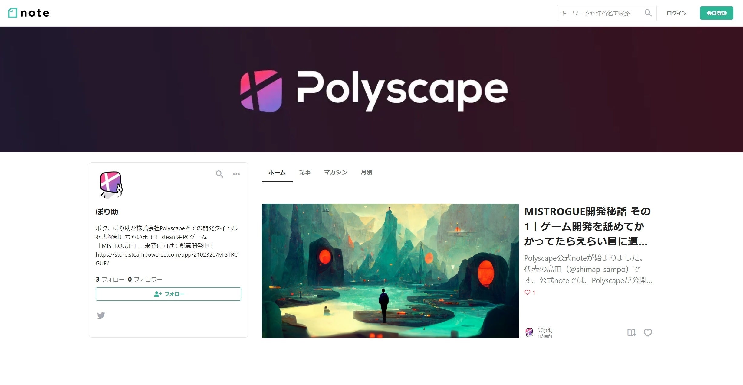 多くのクリエイターで盛り上がるメディアプラットフォーム「note」に株式会社Polyscapeが参入。代表取締役自らが現在開発中のゲーム「MISTROGUE」が完成するまでの様子を随時公開する。