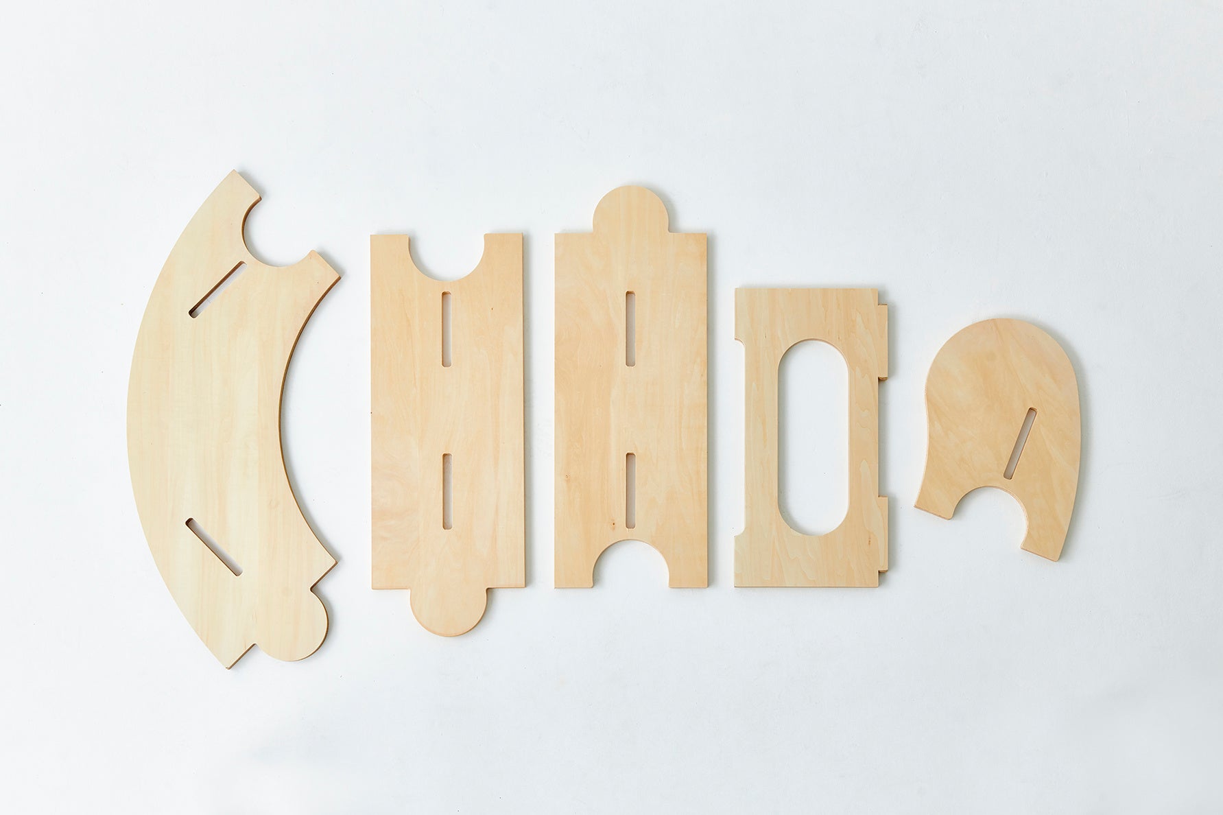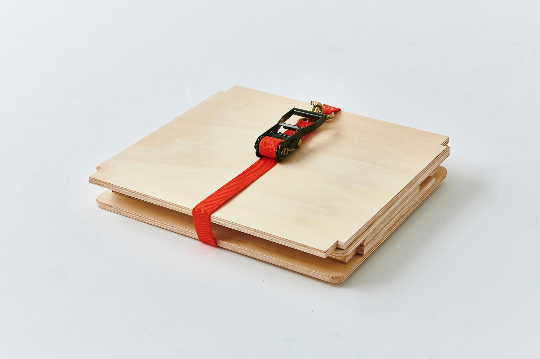 木組をベルトで固定する BUBBLES チェア。 持ち運びもしやすく、設置場所を選ばない、道具のような家具です。