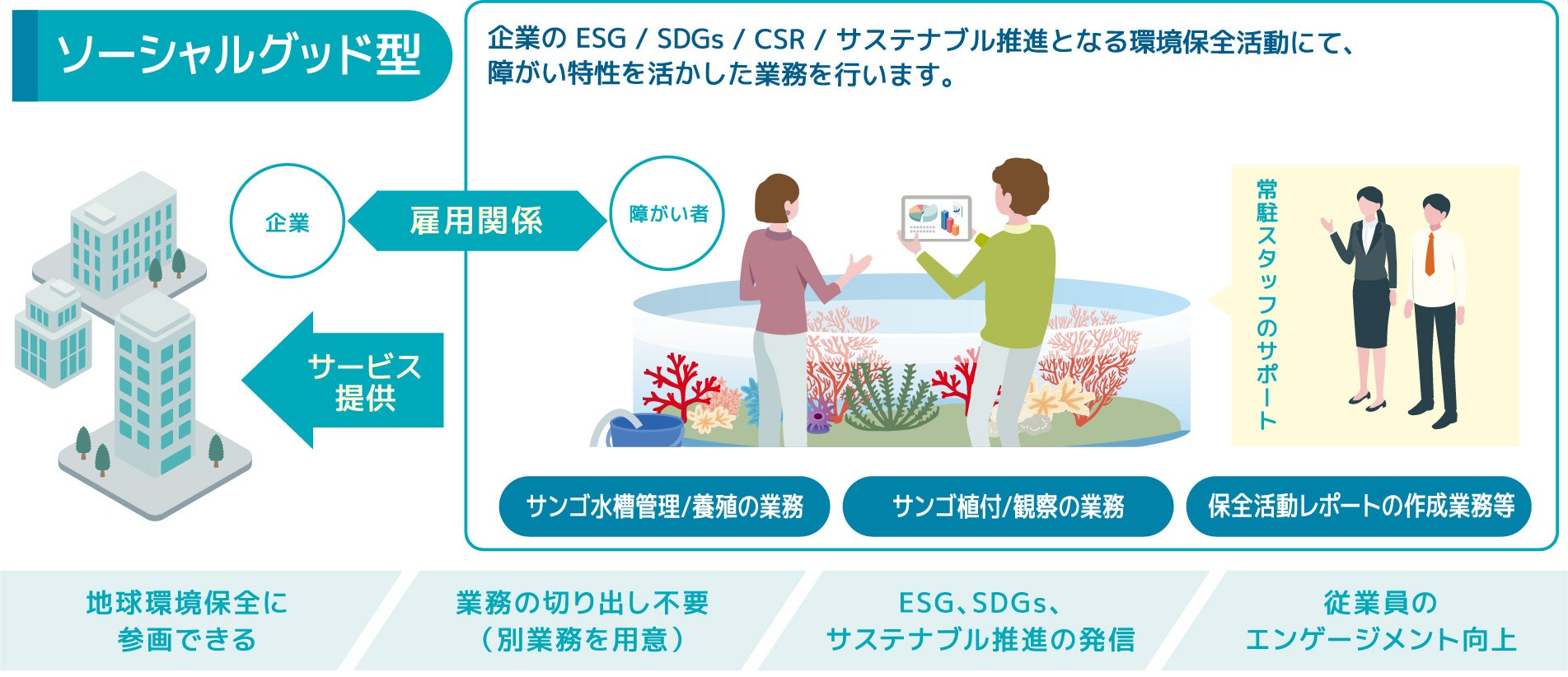 障がい者雇用支援サービスとは、企業が障がい者雇用課題を解決するために、障がい者専門の就労サポート付きの職場環境(サテライトオフィス等)を企業に提供する業態として注目されています。精神、発達、知的、身体など、多様な障がい種別の方が働いており、サポートスタッフが常駐し、業務の支援や体調のケアなど安心して長く働ける環境が用意されています。主な提供の型として、「農園型」、「オフィス型」が存在している中、このたび新たに「ソーシャルグッド型」の障がい者雇用支援サービスをスタートしました。ソーシャルグッド型の障がい者雇用では、企業のESG / SDGs / CSR / サステナブル推進となる環境保全活動において、障がいのある方の特性を活かした業務を行うことが可能です。