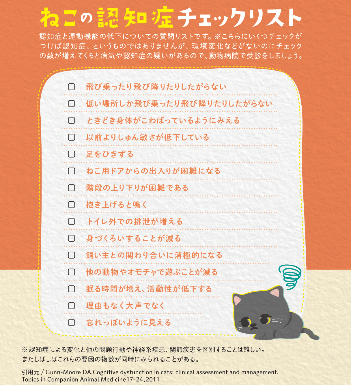 ・ねこの認知症チェックリストで、ひとつでも当てはまるねこちゃんを飼われている方。