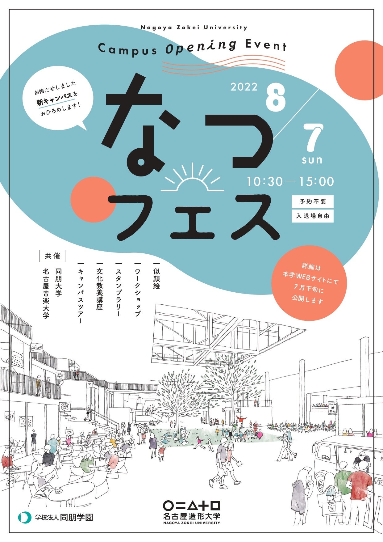 同朋学園 名城公園キャンパス 名古屋造形大学はこの4月に愛知県小牧市より愛知県名古屋市北区の名城2丁目へ移転してきました。この度新キャンパスを地域の皆様に開放し、見学していただけるイベント「なつフェス」を開催します。同朋学園の同朋大学、名古屋音楽大学も一緒にイベントに参加します。