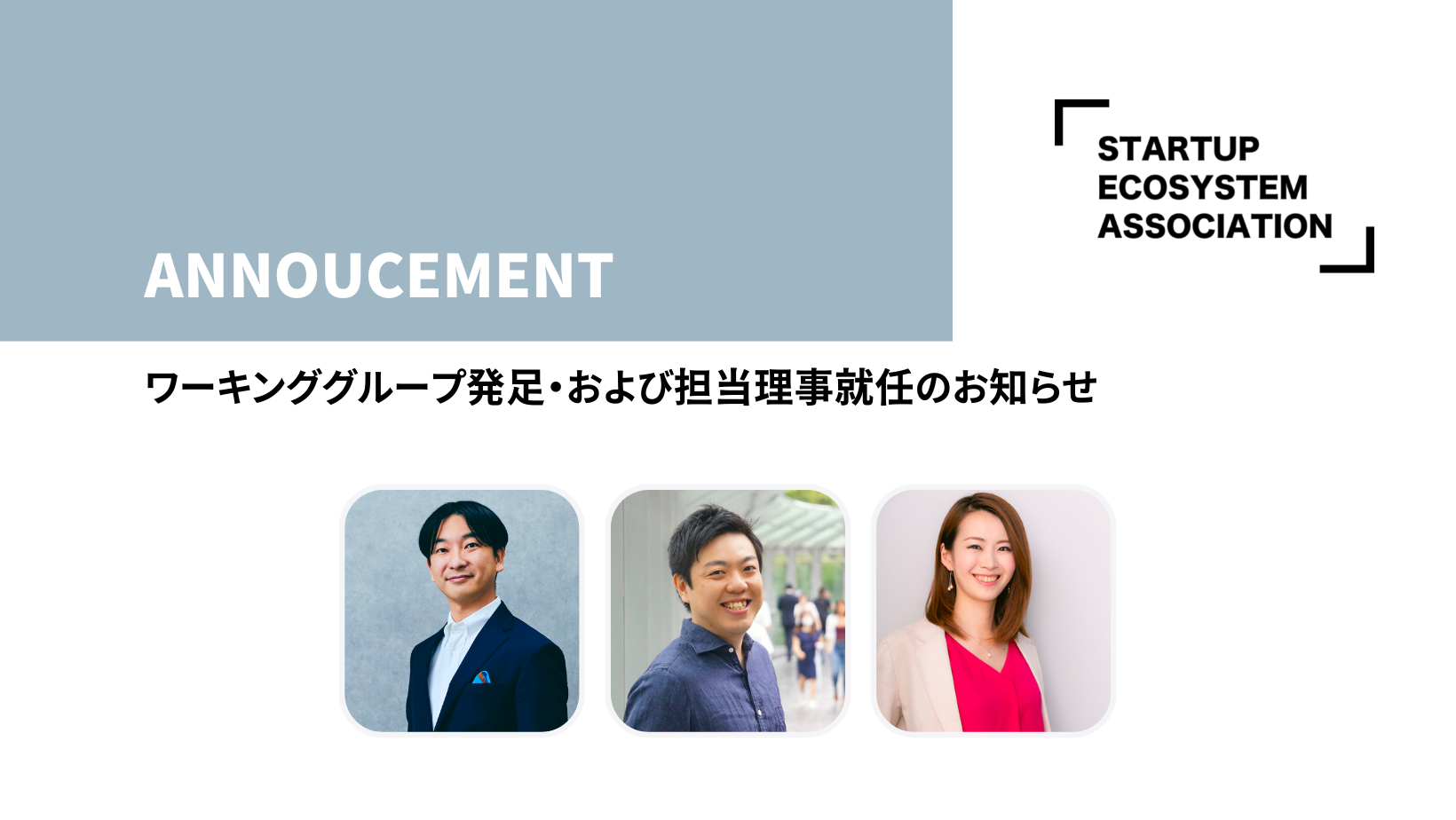 スタートアップが数多く産まれ、成長し、最終的には経済発展に貢献できるような環境・生態系(エコシステム)を実現することを目標として設立された一般社団法人スタートアップエコシステム協会( 所在地:東京都渋谷区 、略称: SEAJ)は、8月30日付けで朝倉祐介氏、唐澤俊輔氏、鈴木萌子氏が新たに理事に就任したことをお知らせします。