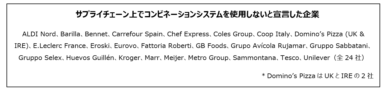 今回の「エッグトラック・レポート」では、下記24社がサプライチェーン上でコンビネーションシステムを使用しない旨を宣言しています。