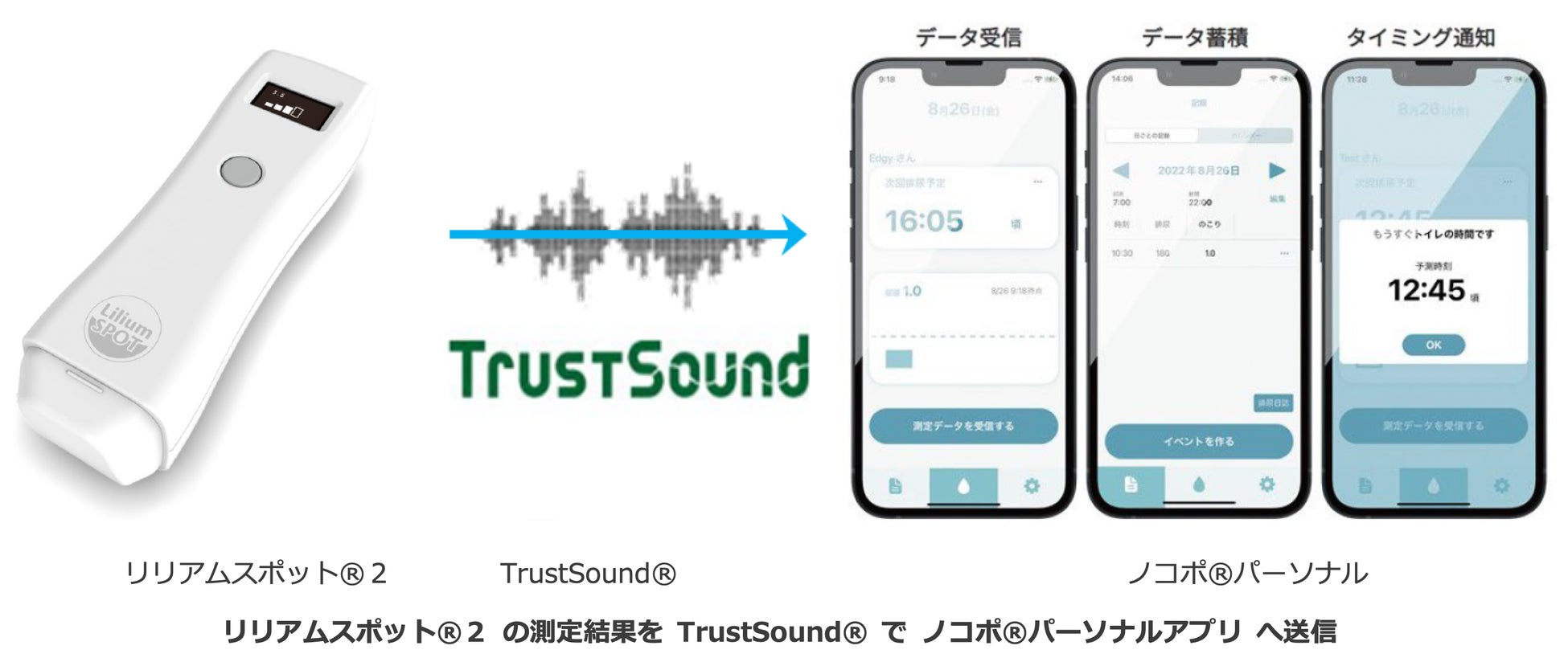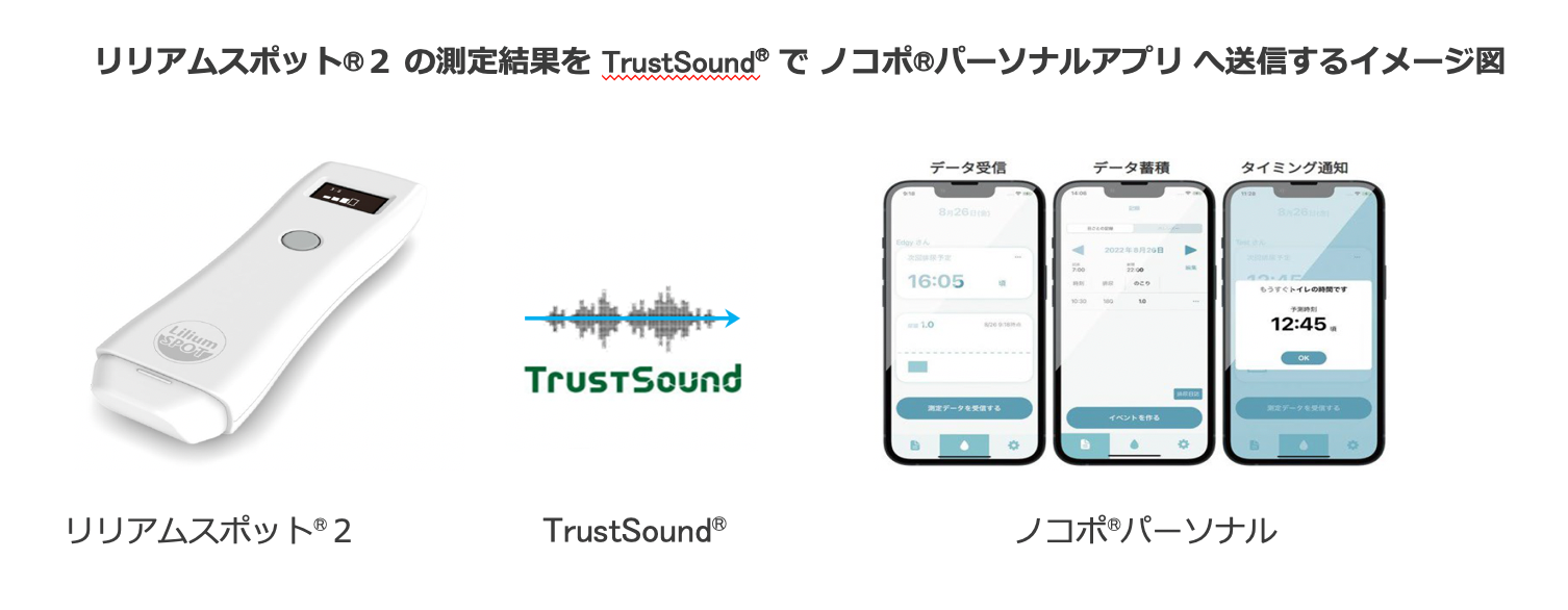 音波通信の独自技術で事業を展開している株式会社スマート・ソリューション・テクノロジー(本社:東京都新宿区、代表取締役:山川 進、以下 SST)は、独自技術の音波通信「TrustSound®」が、大塚ホールディングス株式会社子会社である株式会社リリアム大塚(本社:神奈川県相模原市、代表取締役社長:白﨑 功、以下 リリアム大塚)が提供する排尿タイミング予測支援デバイス「リリアムスポット®2」、及び同社が開発したリリアムスポット®2と連携するスマートフォンアプリ「ノコポ®パーソナル(iOS版)」に採用されたことをお知らせいたします。尚、東京ビックサイト東展示棟(東京都江東区)にて2022年10月26日(水)~28日(金)の期間で開催される医療・福祉施設のための設備・機器の総合展示会HOSPEX Japan 2022にてリリアムスポット®2、ノコポ®パーソナル、TrustSound®のデモ展示を行います。皆様のご来場をお待ちしております。