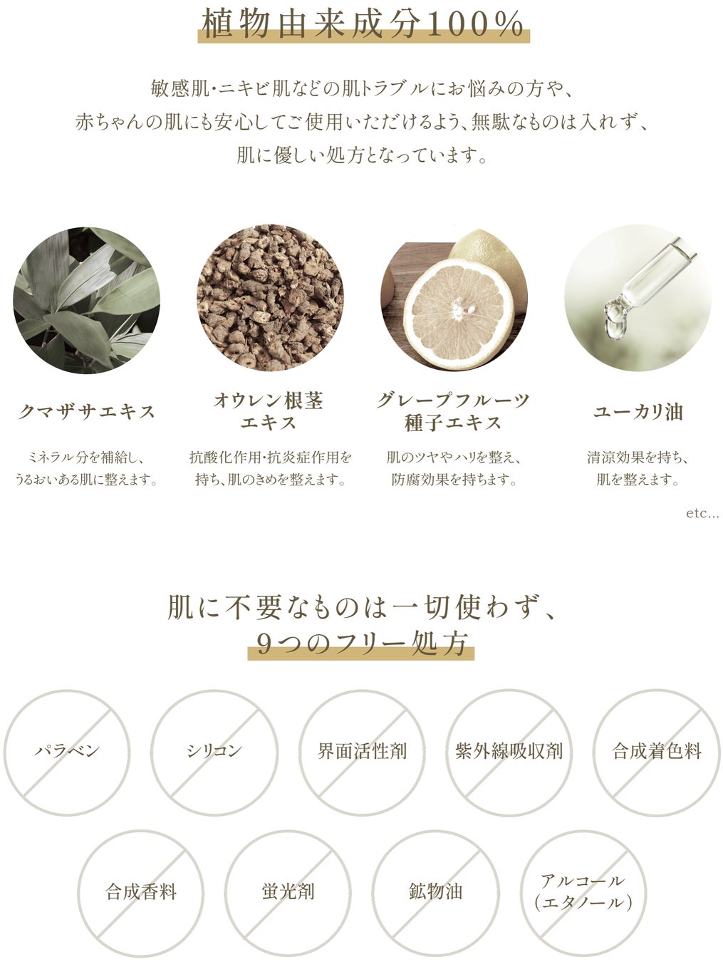 *パラベン・シリコン・界面活性剤・紫外線吸収剤・合成着色料・合成香料・蛍光剤・鉱物油・アルコール(エタノール)一切不使用。