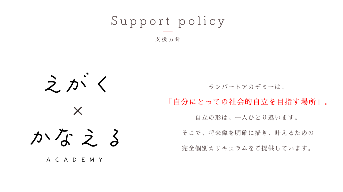 ランパートアカデミーは、障害をもつ一人ひとりの成長をサポートしてきました。一人ひとりの将来像を明確に描き、叶えるという意味を込めた「えがく×かなえる」という支援方針をはじめ、日頃、大切にしている思いをお伝えしています。