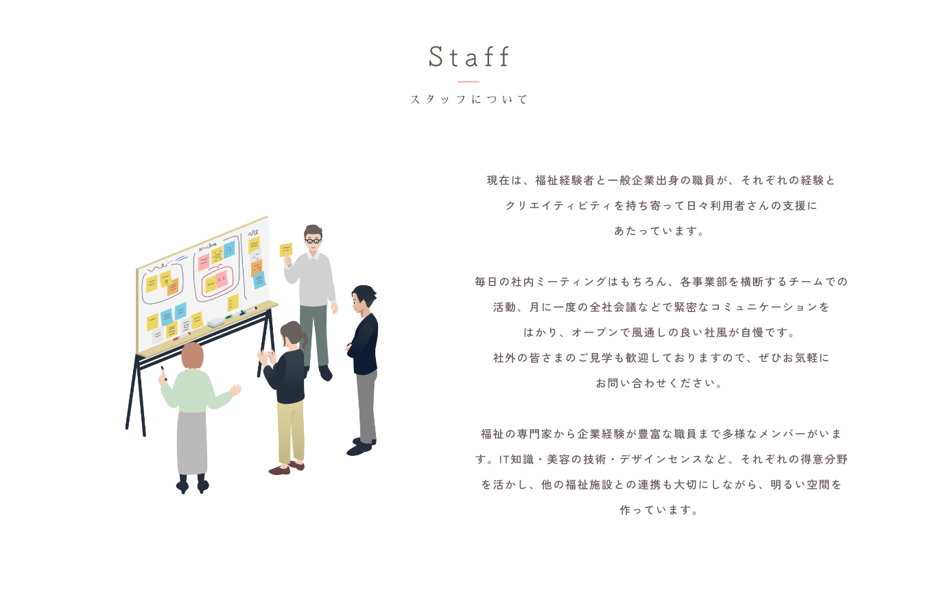 福祉経験者だけでなく、IT知識が豊富な職員、デザインセンスが高い職員など、様々な強みをもつスタッフが施設利用者の皆様の成長をサポートしています。