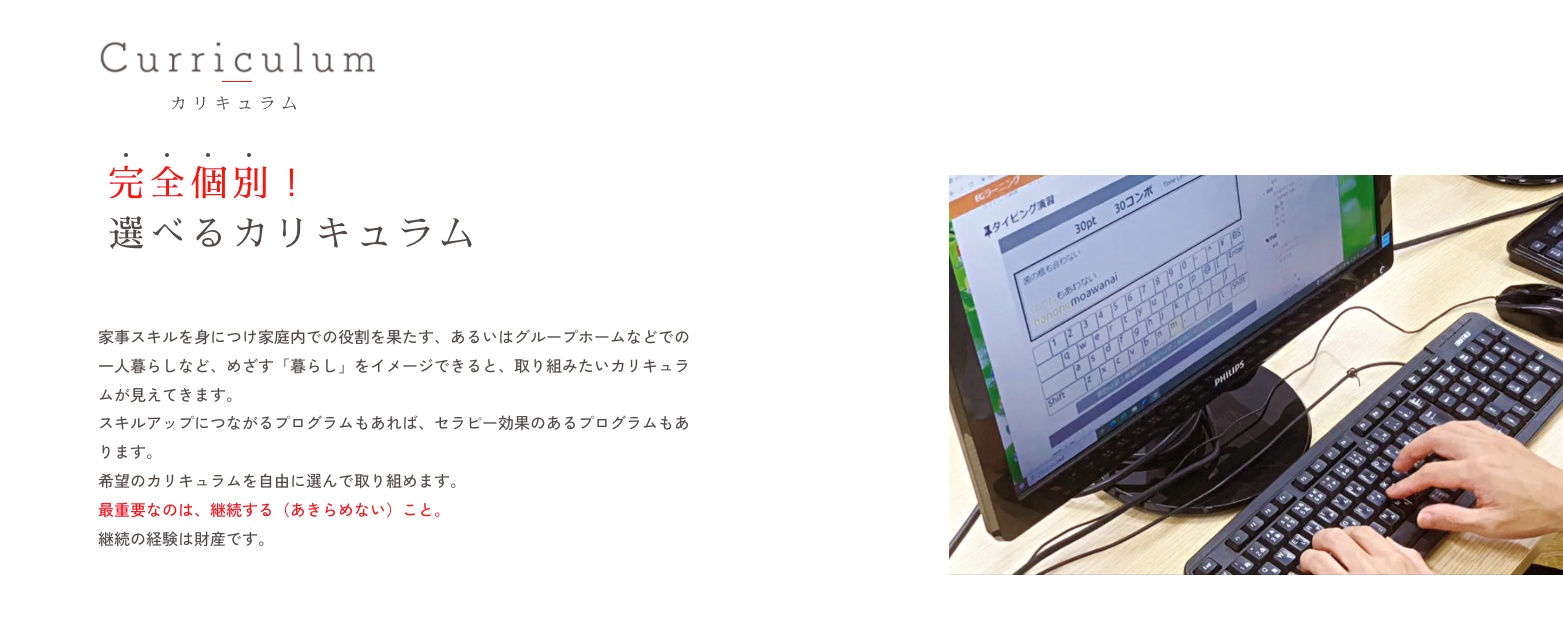 金銭管理、家事スキル、アート活動、ITスキル、,コミュニケーションスキルなどを学ぶカリキュラムで、施設利用者の皆様が具体的にどのような活動に取り組んでいるのか、写真も交えてご紹介しています。