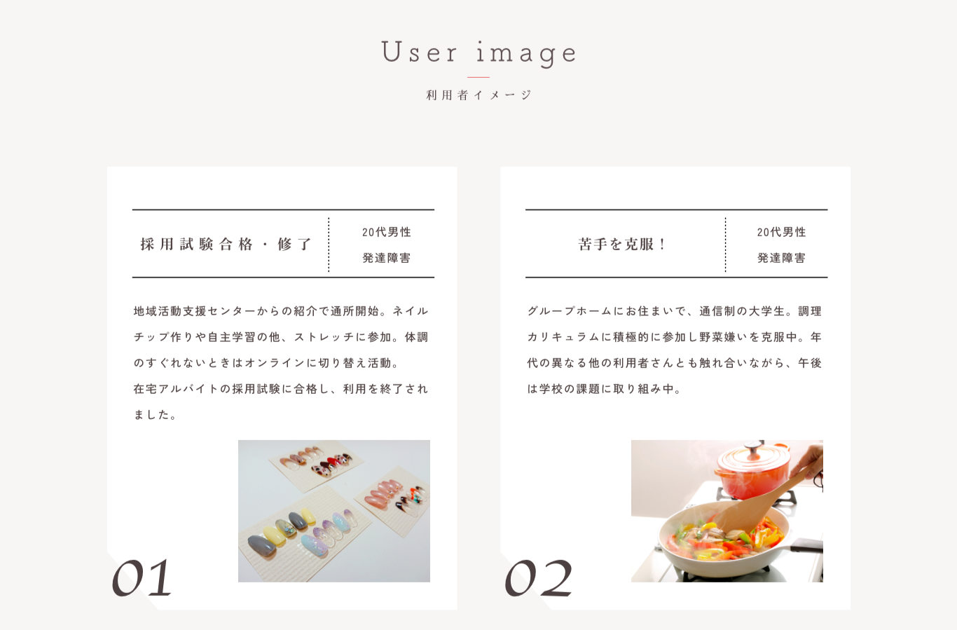 施設のあたたかな雰囲気や、入所後に身につけられるスキルを知っていただけるよう、施設内の写真を多数掲載したり、個別のカリキュラムを詳細に紹介したりしています。