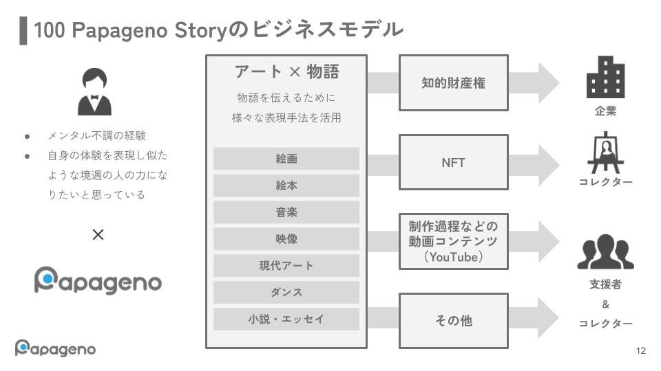 メンタルヘルスアートNFT事業を展開する株式会社パパゲーノ(本社:東京都渋谷区、代表取締役 田中康雅)は2022年4月28日、『100 Papageno Story』第一弾として統合失調症当事者による絵本『飛べない鳥のかけるん』の制作を開始し、企画概要動画をYouTubeチャンネルにて公表しました。