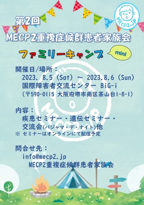 MECP2重複症候群患者家族会ファミリーキャンプminiは、MECP2重複症候群の研究や診療に関わる医療者と患者さんのご家族が参加するセミナー・交流会です。今回、対面イベントとして4年ぶりに開催されます。