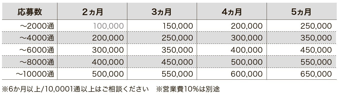 ・1000通/2ヶ月で10万円だった少数応募型は、2000通で10万円と利用可能数を2倍に増加。