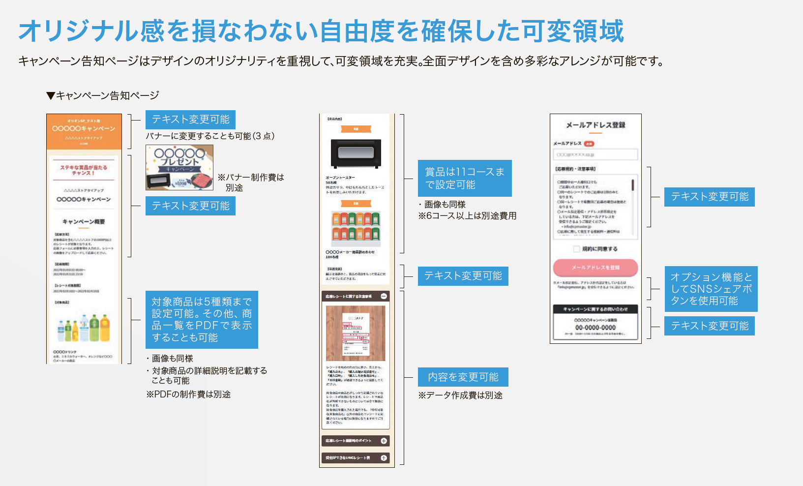 2)ノウハウを活かし、可変できる領域を増やすことで、オリジナル感のあるデザインを実現可能。