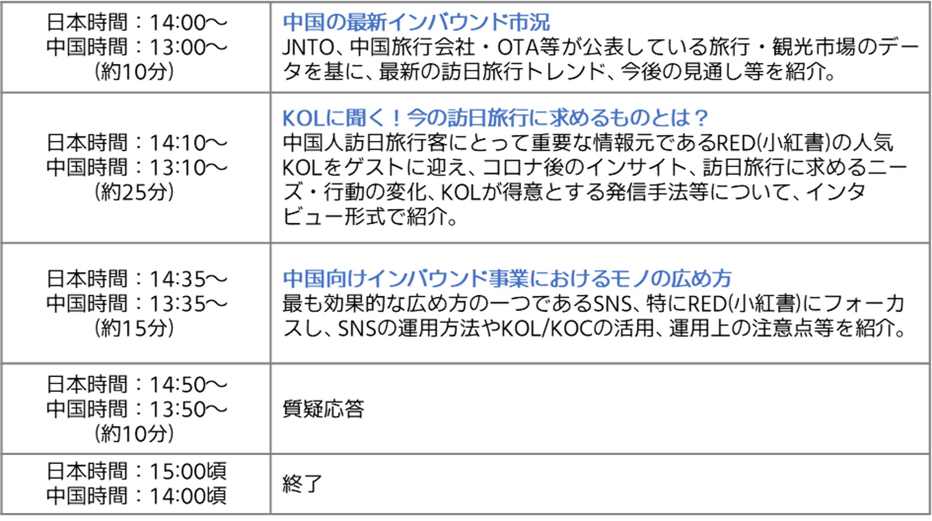 本セミナーでは、パンデミック後に変化があったと言われる訪日中国人客の最新のニーズをとらえるべく、訪日旅行事業の第一線で活躍する中国人KOL(Key Opinion Leader)を招いたトークセッションをはじめ、中国現地で多数のインバウンド事業を手掛けてきたベクトル中国のスタッフが、中国マーケティングの最新トレンドを紹介します。