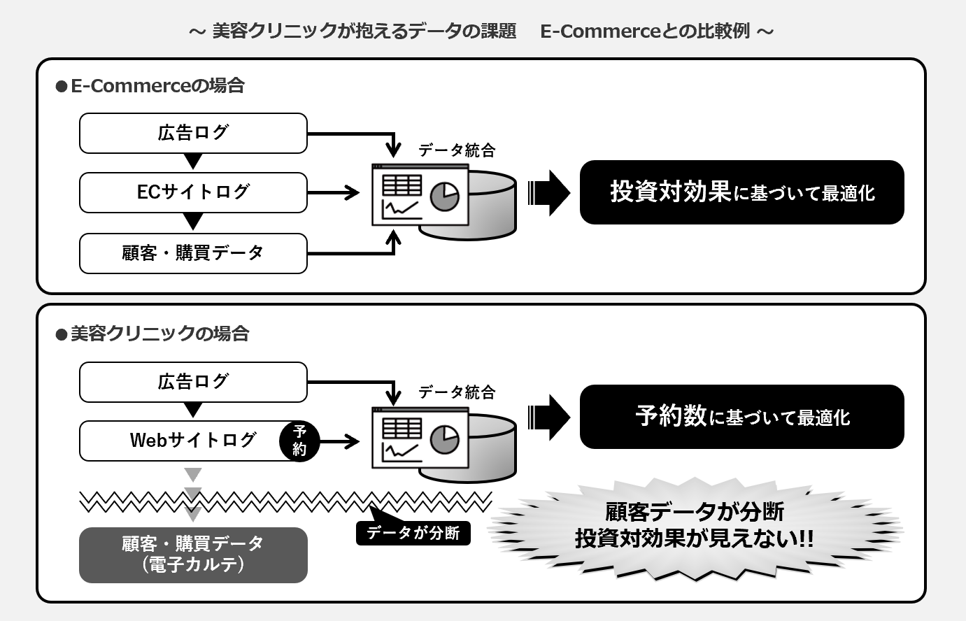 美容クリニックのマーケティングにはもともと解決が困難な環境的課題があります。EC(E-Commerce)との比較を用いて解説しましょう。ECの場合、インターネット広告をはじめとしたさまざまな集客施策を経て、ECサイト内で誰が、いつ、何を、いくらで購入したかがリアルタイムで可視化され、投資対効果に基づいたPDCAを実施できる環境が整っています。