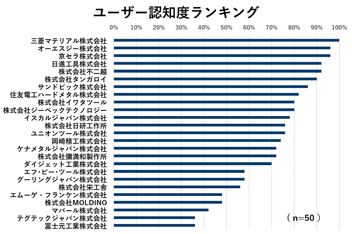 切削工具メーカー25社について、ユーザー認知度の上位10社は下記となりました。