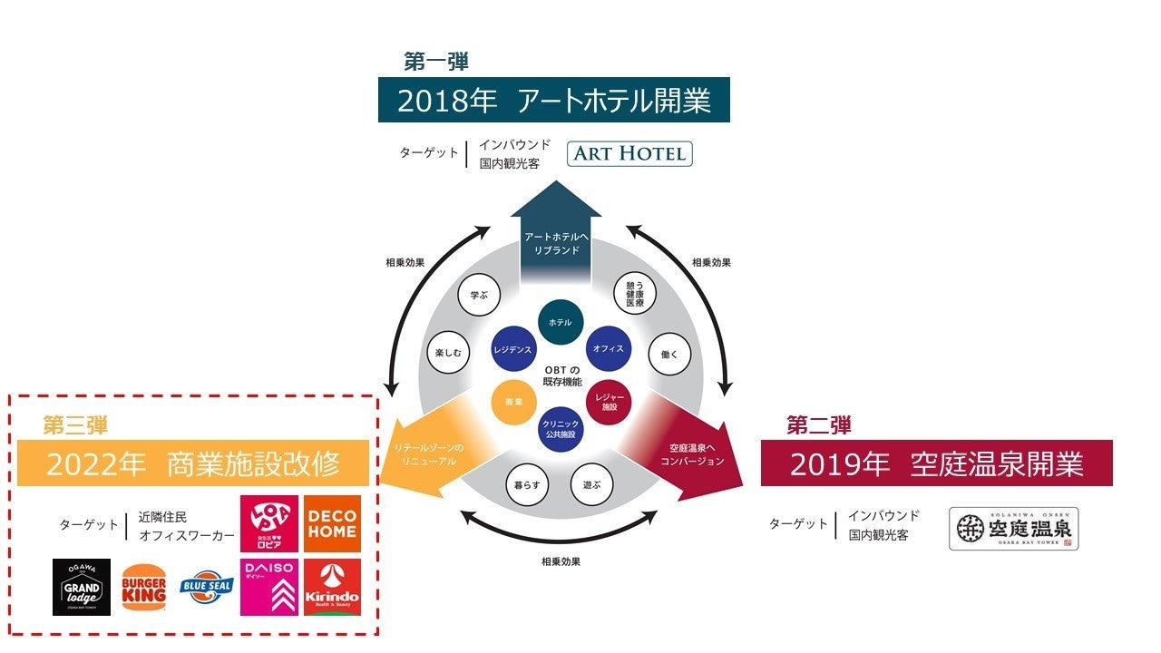 再生計画の第一弾として、2018年3月29日(木)に株式会社マイステイズ・ホテル・マネジメントが運営するフルサービス型ホテル「アートホテルOSAKA BAY TOWER」のリブランドオープン。第二弾として、2019年2月26日(火)に延床面積約5,000坪の天然温泉を有する関西最大級の都心型温浴テーマパーク「空庭温泉OSAKA BAY TOWER」を開業し 、弁天町のエリアの再開発・再生を進めてきました。