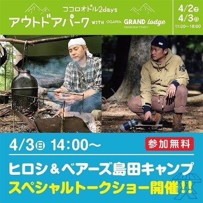 本リニューアルを記念して、4月1日(金)にオープンする今注目のアウトドア専門店「ogawa GRAND lodge」とタイアップして「アウトドアパーク」を4月2日(土)・3日(日)に開催、キャンプ芸人ヒロシ&ベアーズ島田キャンプのスペシャルトークショーを行います。