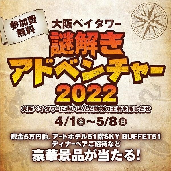 大阪ベイタワー内のお店や施設、空庭温泉をまわって、5つの謎解きに挑戦いただきます。最終答えを導き出し抽選会に参加すると現金5万円他、アートホテル51階SKY BUFFET51 ディナーペアご招待券など豪華景品が当たります。
